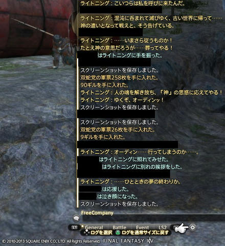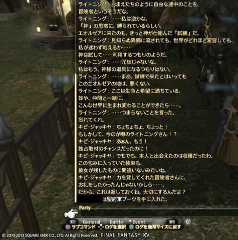 閃光の影向、クリア Final Fantasy XIV 2013年11月21日 話題:新生Final Fantasy XIV ライトニングリターンズ:ファイナルファンタジーXIII(LRFF13)とのコラボイベント 「閃光の影向」(12月9日まで開催)のフェーズ4が20日に解放され、早速、行ってきました フェーズ4のFATEは連続FATEとなっていて、最初は雑魚退治、次にボス討伐という流れになっています 場所は、モードゥナの中央辺り、広い場所ですね さすがに初日のゴールデンタイムは人が多く、特に、キャラを多く表示できないPS3では厳しい・・・ 雑魚退治を乗り越えても、ボスの姿が見えませんw 姿が見えなきゃ殴ることもできず・・・ 評価:銅(イベントの報酬なし)を3度ほど繰り返すことになりました 「さすがに、次で無理なら大人しく日を改めよう」と思い挑んだ4回目 これは神の意志によるものなのか ボスの姿が最初から見えました! こうなりゃこっちのもんですなー ひたすらボコり続けて・・・ 喜びすぎて金だか銀だか忘れましたが、とにかく報酬をゲットできました あとは、空いている時を見計らって、まだゲットしていないFF13デザインの武器を取りに行くつもりです^^ では、イベントのフェーズ3以降で撮ったSSをば クルザスにて フェーズ3の舞台は、クルザス地方のホワイトブリム フェーズ1では、ライトニングさんはさっさといなくなる感じでしたが、フェーズ2以降では、しばらく歩いてからいなくなります 彼女が去るまで、 その後ろをゾロゾロとついていく冒険者たち・・・ もし、エオルゼアに残ってくれて、どっかでグランドカンパニーでも創設してくれたら、入団する人多そうですねぇ・・・ 群衆に混ざって歩きながら、そんなことを思ったりしていました フェーズ3、グリダニアにて FATEを達成して、グリダニア旧市街に滞在している記者のところへ戻って話していると、ライトニングさんがやってきた・・・ さすがに、このコラボイベントのためだけに音声を収録するなんてことはないので、文字だけですが、それでも嬉しいっすな ただ一緒に戦うだけで終わりかと思っていたので フェーズ3、フェーズ4で入るカットシーンは、宿屋の回想録にも記録されています (シーズナルクエスト) イベント終了後も、好きなときに鑑賞できますよ! モードゥナにて フェーズ4の舞台は、モードゥナ地方の中央部辺り 黒い魔人(?)とやらに狙われているというライトニングさんを発見 この後、アヌビスがわらわらと湧いてきて、それを殲滅するとボス登場 ボス登場 デカイので、思いっきりカメラを引いています FATE中の、一連のセリフ この後、グリダニアへ戻って記者と話していると、またライトニングさん登場 カットシーンが入り、決意を固めた彼女は、滅び掛けている故郷へと還っていきます・・・ ちなみに、LRFF13のミコッテ衣装は、このエオルゼア滞在中にプレゼントされたもの、という設定のようです 2つめのSSに出ているキピ・ジャッキヤという記者が、独占取材の際に贈ったと話していました MMOやってるとオフゲーやってる時間ないんですが FF13シリーズはPVを見ただけなので、いつかプレイしてみたいなぁと、ぼんやり思っていますw Amazon.co.jp ウィジェット Amazon.co.jp ウィジェット Amazon.co.jp ウィジェット[0回]