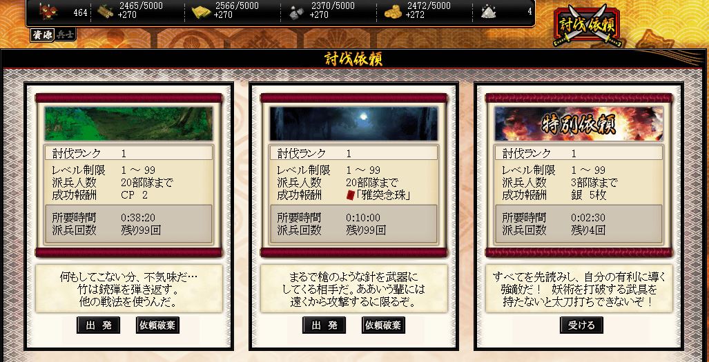 武将の経験値はもちろん、銀やらCPやら装備やらも手に入る討伐依頼