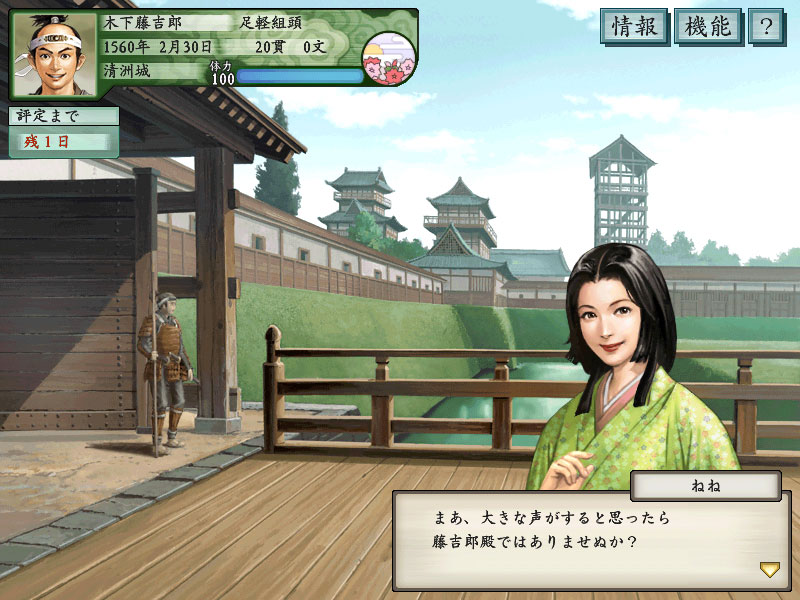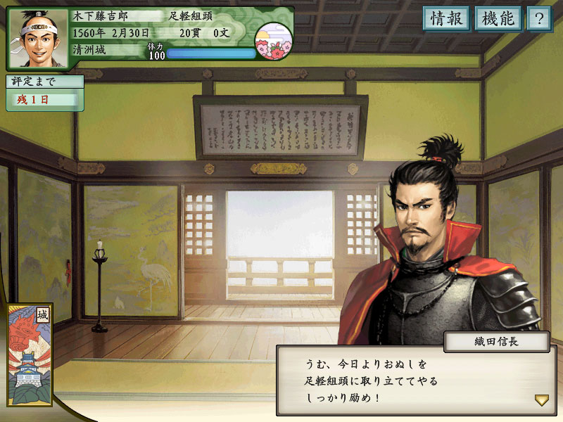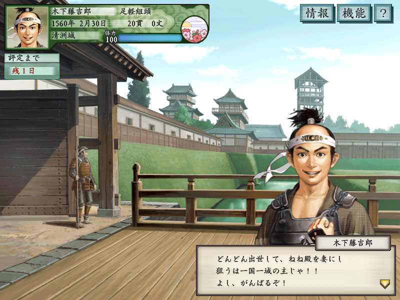 太閤5:サルがゆく・1 太閤立志伝V 2009年10月31日 下記の物語は、(株)コーエーが発売した「太閤立志伝V」(Windows版)のプレイ記録に基づいて綴られています 保存した画像と覚えている範囲内で綴っているため、内容が飛び飛びになっていることがあります また、史実とは異なる行動を執れるため、主人公の性格も含めて多分にフィクションが含まれています 木下藤吉郎 高い弁舌の技能を備え、武力こそ平凡だが全般的に優秀な能力を持っている 尾張の国で農民の子として生を受けたが、「侍になりたい」という思いを胸に各地を転々とする やがて尾張の大名織田家に小者として仕えるようになり、せっせと働く日々を送っていた 2月末のある朝 この日もいつもと同じように、仕事の段取りを考えているところだった 藤吉郎 「さぁて、どのようにして片付けていくかのう・・・ 人と同じことをしていては、いつまで経っても出世などできんからな ・・・なに、信長様がお呼び?これは直ちに参らねば!」 藤吉郎は、主君信長の元へと走った 良い話か、悪い話かは分からない。しかし、待たせてしまえば良い話も悪い話となってしまう恐れがある 短気な信長の場合は、特にそうだった 藤吉郎、侍となる 足軽組頭に取り立てる・・・ その言葉を聞いたとき、藤吉郎は心底驚いた。だから、信長の性格を知っていながら、つい口走ってしまった 藤吉郎 「拙者を足軽組頭に・・・まことでございますか!」 信長 「猿よ、おぬし、主の言葉を疑うか!?」 藤吉郎 「い、いえ、めっそうもございません!ありがたき幸せにございます!」 信長 「ふははははは・・・そうじゃ、素直に喜ぶがよい」 信長は前田利家を呼び、藤吉郎に重要な事柄を教えておくよう指示した藤吉郎は天にも昇る心地だったが、一方で、これが侍としての人生の始まりに過ぎないことも承知していた 奇数月のはじめに城で開かれる評定には、遅れずに出席すること・・・ 評定で受けた主命を達成したら、必ず主に報告すること・・・ 報告が済んでから次の評定が開かれるまでの期間は自由に過ごして良いが、なるべく自己鍛錬に充てるようにすること・・・ 藤吉郎 ---侍になれたとは言え、まだまだ低い身分じゃ。更なる出世のためには、このようなこともおろそかにはできんな そう思いながら、真剣に利家の説明を聞いていたのだった いずれは、ねね殿と 利家が去ってから、いよいよ藤吉郎の心は昂ぶり、ひとり大声で叫び気合を入れた ・・・ひとりだと思っていた、その場にいるのは 藤吉郎は赤面した。ひとりで騒いでいるところを他人に、しかも密かに恋心を抱いている女性に見られてしまったのだ しかし、それで恥ずかしがって黙る藤吉郎ではない。早速、ねねにも侍になったことを報告する 足のつま先から頭のてっぺんまで、身体全体で喜びを表し、興奮気味に語る藤吉郎と、それを微笑ましく見つめ、心から祝福するねね 藤吉郎はこれを機に想いを打ち明けようとしたが、思い止まった。侍とは言っても藤吉郎の身分は低い 藤吉郎 ---今の身分では相手にされぬかもしれんし、もし夫婦になれたとしても、ねね殿に余計な苦労を掛けるかもしれん 藤吉郎は決して軽率な男ではない。自身の置かれている状況を的確に把握・分析し、熟考し、適切な判断を下す・・・それを人よりも迅速に行えるからこそ、才能を認められ侍にもなれたのだ 舞い上がって、場の雰囲気に任せて考えなしに告白するなど、およそ藤吉郎らしくない行動である やがて会話を終え、ねねを見送った藤吉郎天を仰ぎ、拳を握りしめ、改めて気合いを入れる こうして、藤吉郎の侍としての日々が始まったのだった 足軽の修行 1560年5月、藤吉郎は前田利家の自宅を訪ねた 話術には長けている藤吉郎だが、それだけでは侍として生きてはいけない。今後のために、より多彩な技能を他人から教わっておく必要がある とは言え、大して仲も良くない相手に、貴重な時間を割いて技を教える物好きはいない そこで、織田家中でも比較的仲の良い利家に、足軽隊を率いる際に重要なことを教えてもらおうと考えたのだった 利家 「・・・ほう、足軽についてか。よし、分かった。表に出よ、早速模擬戦じゃ!」 藤吉郎の申し出を快諾した利家は手早く兵を集め、その内の半数を率いて自陣へと向かっていった 藤吉郎は残った兵を率い、川を挟んで向かい合う形で陣を敷いた 藤吉郎 ---さて、どう動くかな 模擬戦では、自らが直接指揮する一番備(そなえ)以外はすべて備大将が率いる つまり、名のある武将が率いているわけではない それは相手方も同様であり、双方の総大将の能力差を除けば条件は同じになっている そのため、戦術を誤れば挽回するのは難しい 各備に適切な指示を出し、いかに有利な状況を作り出すかが鍵となる 藤吉郎 「敵が川を渡り始めたら西進、橋を渡り、敵の後ろを衝くのじゃ!」 互いの戦力が拮抗している場合は消耗戦に陥りやすく、正面切ってぶつかれば味方の損害も大