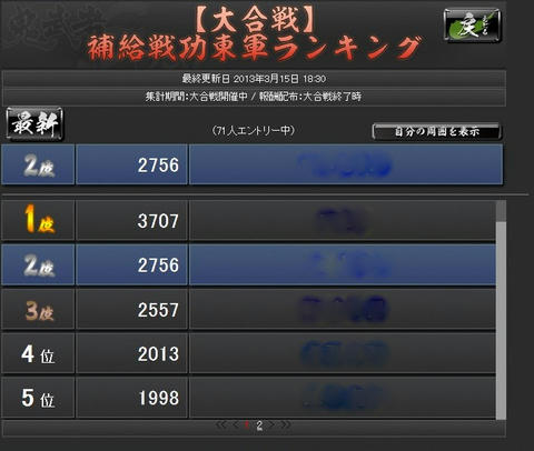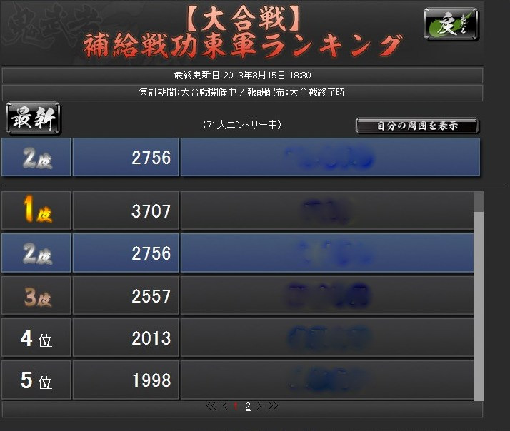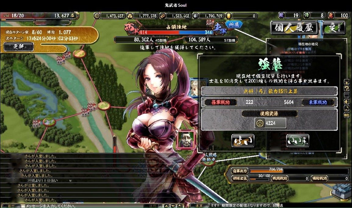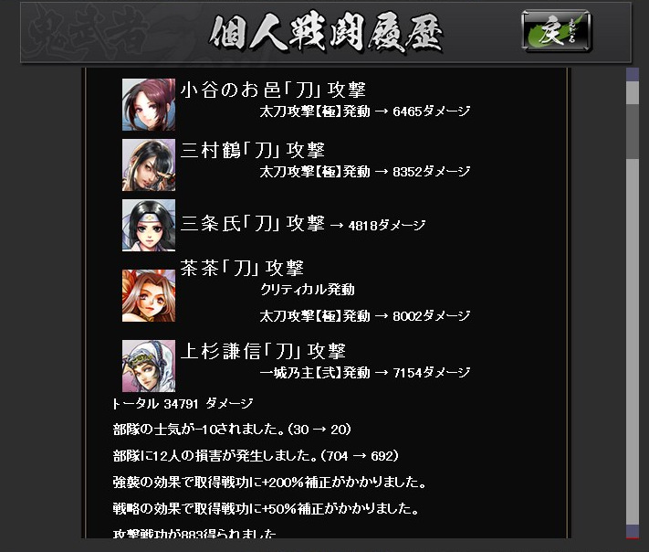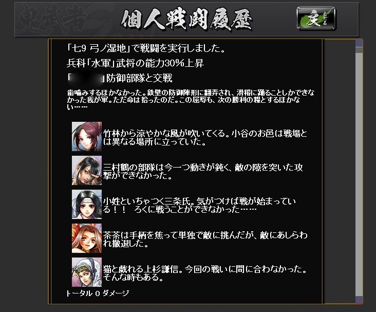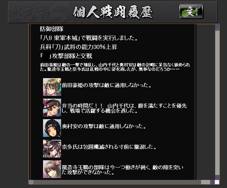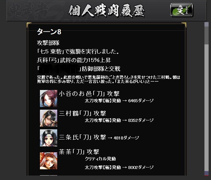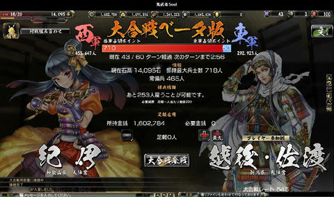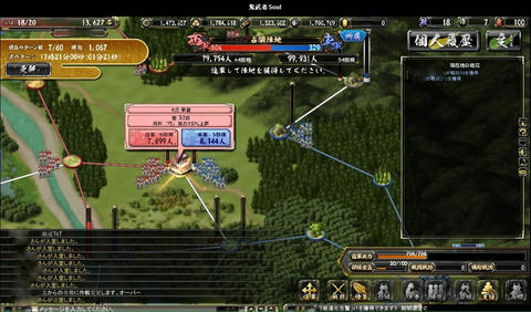 絵で見る大合戦ベータ その他(Online) 2013年03月18日 鬼武者Soulの大合戦ベータ版にちょっくら参加してのレポート なお、ベータ版なので正式版では仕様が異なるおそれもあります (実装後のアップデートによる追加・変更ももちろんあり) まず、国対国でのマッチングが行われます 上部の赤と青のゲージが、双方の獲得している占領ポイントを表していますどうやら我が方は完敗路線のようですな 最長60ターン 1ターンは3分で、その間にいろいろ行動します 率いる部隊の最大兵士数は、自領の石高により決定常備兵の数は、城下町の建築物により決定 足軽は、金銭で一時的に雇って連れて行く兵 戦場では雇えないので、この画面で忘れずに設定します 大合戦は陣取り戦終戦時に、より多くの占領ポイントを有していた側が勝利となります現在地での敵味方の行動は右のウィンドウに表示 チャットウィンドウの行数は調整できますウィンドウと重なっている部分のボタンを押せないようなので、その場合は行数調整を行動には物資を消費し、行動終了までいくらか時間が掛かります・・・が、短時間で行動終了するように変更されたそうで、いろいろと行動できます戦闘を仕掛けると結果がこのように表示されます陣地の地形によって、有利になる兵科が決まっています女性武将なのに、「彼」という表記になってますw支障はなくとも気になる人は気になるので、しっかり設定しておいてほしいところターン終了時に獲得戦功の多い側が、その陣地を支配するシステムちなみに、戦闘に負けた時には言い訳(?)が表示されます履歴から、防御部隊の戦闘結果も確認できます戦闘以外の行動・・・進軍部隊を進めるもので、味方領内は1度に何マスでも進めます敵領内は1マスずつ後述の行動の中には味方領内でないと実行できないものもあるので、基本的には補給線を確保しつつ進軍してゆくことになります休養部隊の士気を高め、被害を軽減獲得戦功が増加する強襲を行うと、士気が低下します支援味方全体の補給値が上昇失った兵の補充を行うには補給値が必要なので、これを行う人がいないと戦闘継続が困難になりますただ、物資を結構消費します・・・戦略指定したマスの味方部隊を強化具体的な効果は知りませんが、少なくとも獲得戦功が5割増しになっていることは、戦闘履歴から分かりました獲得戦功の多い側が陣地を支配するシステムなので、地味に重要かもしれません最初はとにかくワケが分からなかったので、少し戦ったあとはせっせと支援していましたその甲斐あって、一時的に補給ランキングで2位にw終戦時に確定した順位では7位でしたが、まだまだ駆け出しでも10位以内に入れたということ部隊が弱くても物資さえあれば、こっちで貢献できそうです感想ターン終了時に獲得戦功の多い側が陣地を支配するというシステムが、十分に周知されていなかったように見受けられました肝の部分が分からなければ、「何したらいいかわかんね」になってしまいますねとりあえず攻撃してみてるけど、なんか敵兵減らないし・・・とそれが周知されたとして・・・個人的には、部隊の兵士数がどれほど活かされているのかが、気になりました本城まで攻め込まれたときなど、攻撃側は1万くらい、防御側は10万くらい兵がいるのに、ほとんど兵士数に変化がない・・・それほどの状況なら、常識的に考えれば激しい攻防が繰り広げられ、もっと兵士数に変化があるはずダイナミックに兵士数が変化した方が、面白いと思います「大合戦」ですからそうするとあっさり倒される部隊も出てくるでしょうが・・・(うちなんかその候補)そこは、単独部隊では戦力としてイマイチでも、軍、もしくは同じマスにいる部隊全体で補い合って戦えるようになればとたとえば、「信長の野望~天道~」では、3部隊以上が集まって陣形を組むと「軍勢」という扱いになり、武将の能力値より、覚えている技能や適性の方が重要になります軍勢自体の統率力・武勇・知略などは、陣形参加武将の中でもっとも数値の高い武将のものになるので明らかに戦向けでない武将でも、編成次第で役立つことがありますそんな感じ鬼武者Soulの大合戦は、そういったゲームに比べるとまだ荒削りな印象ですとはいえ、戦場マップで陣取りを行うこと自体は楽しいので、今後に期待といったところでしょうか Amazon.co.jp ウィジェット Amazon.co.jp ウィジェット Amazon.co.jp ウィジェット[0回]