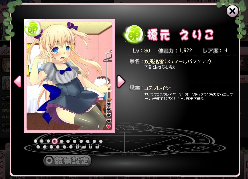 疾風迅雷・・・? その他(Online) 2013年07月23日 ペロペロ催眠の各キャラに設定されている拳名(とその効果)についてはアホらしい(褒め言葉)ものが多いですが、また笑っちまうのがあったので掲載 疾風迅雷!! おぉ、カッコイイな ・・・と思ったら効果とのギャップがものすごい でも、疾風のごとき素早さで抜き取る・・・ その光景を何となくイメージできてしまうからまた面白い 公式サイトの図鑑によると現在165名のキャラがいるようですが、ひとりひとりに拳名と効果が設定されています 別にプレイ中に発動するものではなく、キャラの個性みたいなもんだと解釈していますが、よくこれだけおバカな技を考えたものだと、感心しています(褒めています このスティールパンツランをググってみたら何か出てきたので、元ネタのあるものも多そうですけどね Amazon.co.jp ウィジェット Amazon.co.jp ウィジェット Amazon.co.jp ウィジェット[0回]