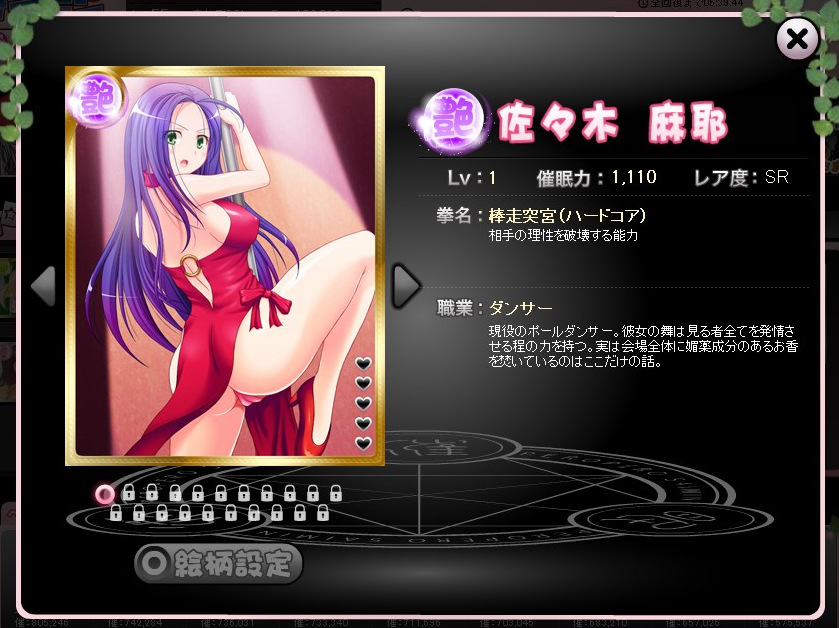 大作戦スタート その他(Online) 2013年10月04日 話題:ペロペロ催眠 最近、運がないんですよ・・・ イベント直前に追加される特効キャラが、軒並みゲットできない呪いを掛けられているようですw ノーマルはペロを注ぎ込めば良いだけなので見ることはできるんですが、当たりませんねぇ・・・ レア・スーパーレアに至っては姿すら見せませんで (イベントでためたレアガチャチケットも全部はずれ) そんなションボリな中、ペロペロ大作戦が始まりました 今回はスポーツフェスタに乗り込むようですな 受付にて、裸王がここにいることを知って我を忘れ、力尽くで押し通ろうとする主人公をたしなめる愛瑠さん 我に返る主人公 言われるままに殴る愛瑠さん ちなみに愛瑠さんは、手加減というものを知らない・・・ いやー、毎回のこのノリ、好きだわw ノリと言えば・・・ 今回の大作戦期間中、左上のナビゲーター愛瑠さんが赤帽かぶったり白帽かぶったりしていて、「お、雰囲気出してるなー」と思って楽しんでいたら・・・ まさかの、 ウ、ル、ト、ラ、マン!!!!! えぇ、いましたよー 赤白帽をこんな風にかぶってウルトラマンして喜んでるヤツが 僕はやりませんでしたが 時に、意外なところを衝いて楽しませてくれるので、ペロペロ催眠を続けています 簡単にプレイ継続の理由を書いてみると・・・ いろんな女の子を集めて、育てたいから・・・45% おバカなノリを楽しみたいから・・・45% ゲームが面白いから・・・10% まぁ、ゲームそのものは惰性でやってるようなもんです イベントの雰囲気が楽しいので続けてます 前の大作戦(肝試し編)は雰囲気出し過ぎて「怖いからやらない!」なんて人もいたようですがw 今回はすがすがしいスポーツ編なので安心ですな 作戦 前回は、前半戦ペロナミンを温存して、後半戦で一気に仕掛ける作戦でした そのため難なく200ヶ所到達できたわけですが、予想以上にペロナミンが残ってしまったので、今回は前半戦から使っていきます ペロペロメガネは前回同様、後半戦の終盤に備えて温存しておきます ぬかりはありやせんぜ! これだけのペロナミン(と体力)があれば、200ヶ所到達は余裕 ランキング上位? そんなの知りません 道中の敵は、金のアタッシュケース/鍵を出すリリスだけ、精力の回復を待って倒しています 他のふたりは、精力が不足していても強引に通ります (逃走させる) あ、そうそう 運を使い果たしているはずなんですが、こんなの手に入りました アタッシュケース限定のSRキャラ しかも、一番格が低いピンクアタッシュケースから出ました・・・ えらく幸先が良いなぁと思うのですが、いつまで続くやら Amazon.co.jp ウィジェット Amazon.co.jp ウィジェット Amazon.co.jp ウィジェット[0回]