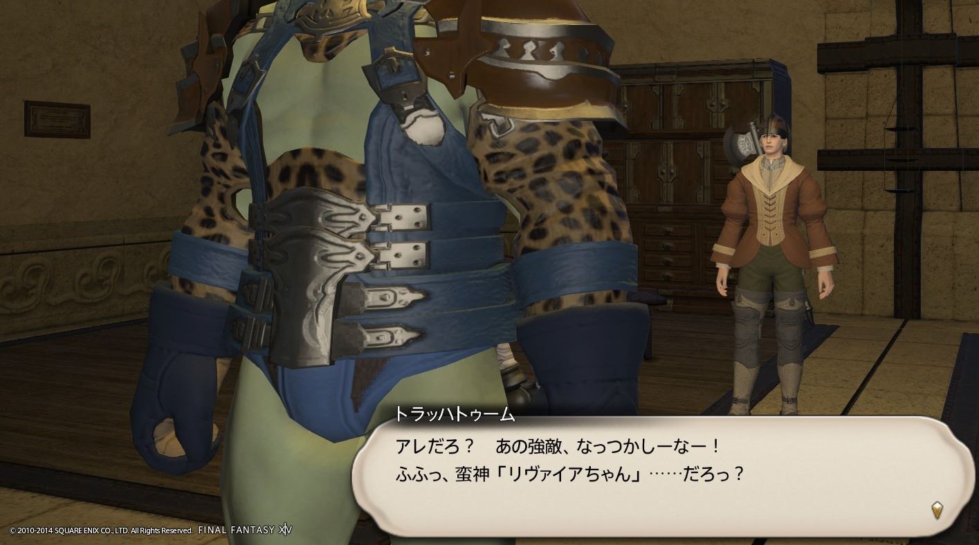 奴の名は・・・ Final Fantasy XIV 2014年04月29日 話題:Final Fantasy XIV 今回掲載のスクリーンショットは ギャラリーへのリンクではないため記事上で拡大表示できます 東ラノシアのワインポートで受けるギルドリーヴだったかな? 誘導任務中・・・ ふと誘導対象の顔を見たところ・・・ お、かわいいな と思い、つい撮ってしまったw NPCにも可愛いのが多いんすよねぇ もっとも、設定上では結構なお年ってこともあるんですが・・・ なに、ミコッテ族ばかり撮ってるって? い や ま さ か 、 そ ん な は ず は ・ ・ ・ お次はメインクエスト 帝国編の後に連なるストーリー ドマです、ドマ FF6で出てきたドマ 登場人物の名前や外見が東アジア風 将来、侍や忍者といった和風のジョブを追加する際はドマが発祥という設定になるんでしょうかねー リムサ・ロミンサに危機が迫る・・・ 3月下旬の大型パッチで実装された水神リヴァイアサン サハギン族が崇める蛮神 シリーズでお馴染みの大海嘯(だいかいしょう)は、陸地の地形を変えてしまうほどの破壊力を持つという設定 そんなもんを街に向けて放たれたら一発でリムサ・ロミンサが壊滅しかねないので、とにかく阻止しに行きますよ という話っすね リヴァイアちゃん えらく可愛らしいじゃないか・・・ タイタンもあんな名前で呼んでたしなぁ 意外にネーミングセンスは良いのかもしれない・・・? といっても、ただ勘違いして名前を記憶しているだけなんだけど Amazon.co.jp ウィジェット Amazon.co.jp ウィジェット Amazon.co.jp ウィジェット[0回]