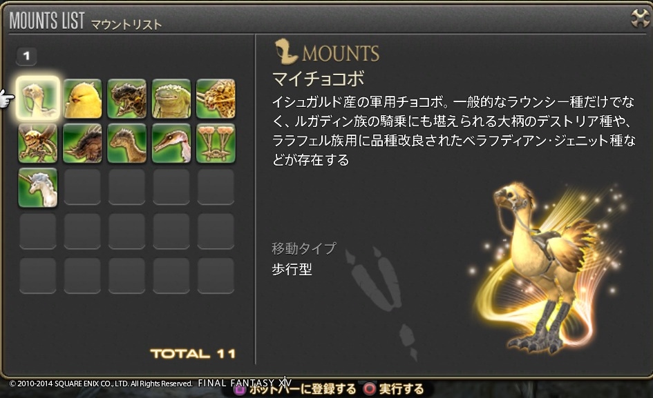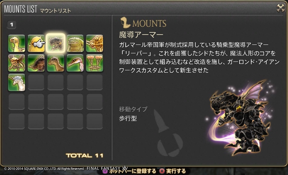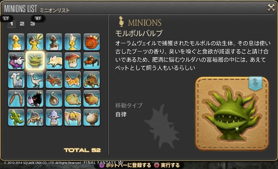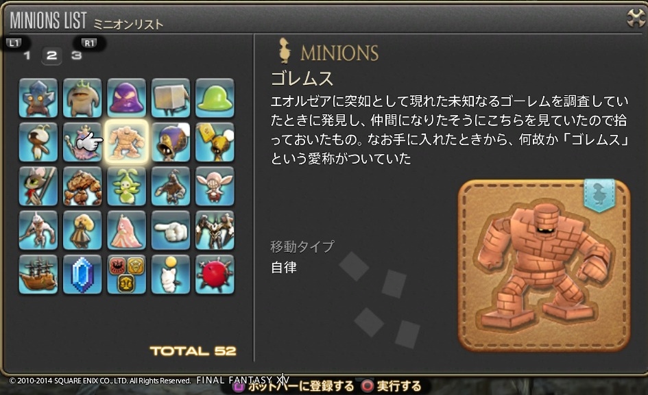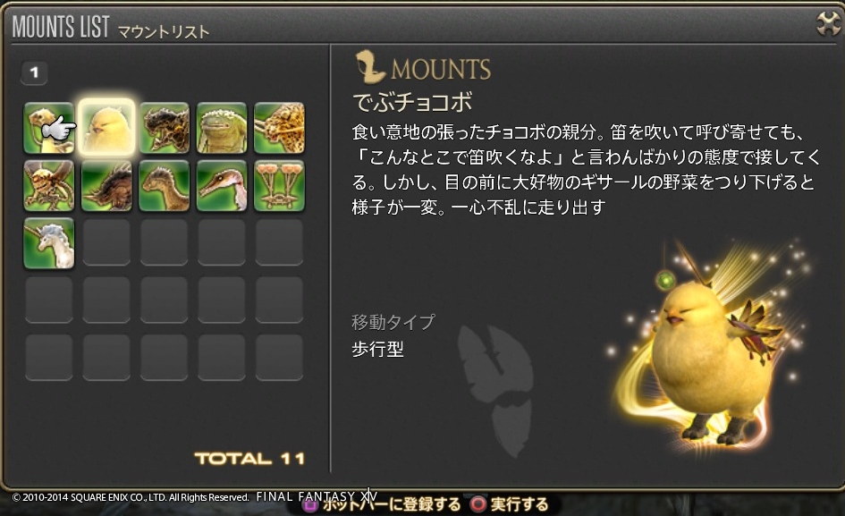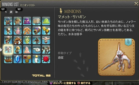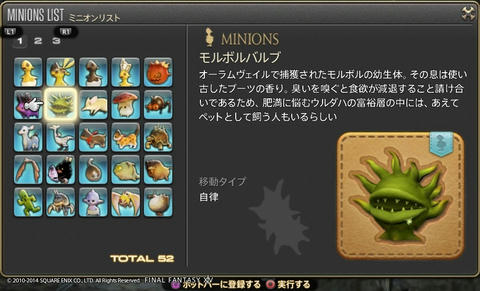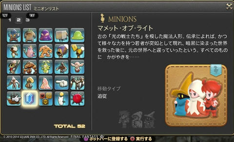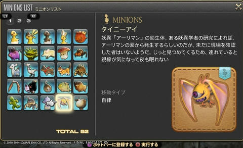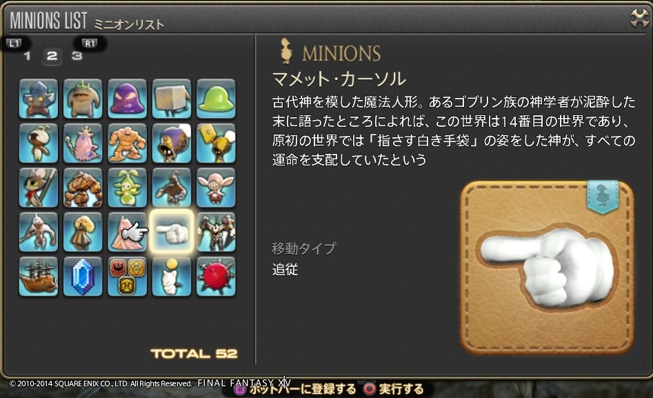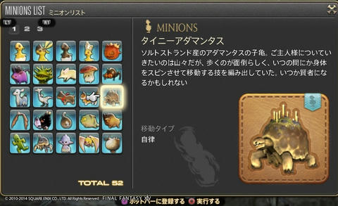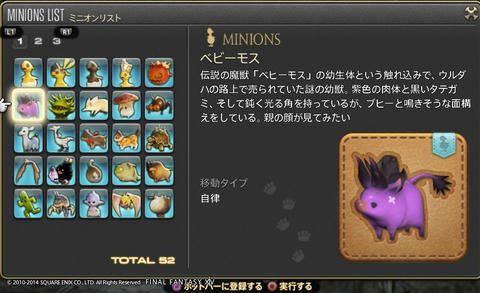 ゲーム開発者に遊び心は必要だよね Final Fantasy XIV 2014年07月15日 話題:Final Fantasy XIVマウント(乗り物)やミニオンのお話ですミニオンプレイヤーキャラの後ろをひたすら付いて歩くだけの存在。巴術士系クラス・ジョブが召喚するペットとは異なり冒険に役立つ効果・機能は一切ないが、誰でも呼び出せる。とにかく種類が豊富で、熱心な愛好家も存在する模様。パッチ2.3からはマウントとミニオンのメニューがアクションリストから分離し、それぞれ独立いわば専用ページが設けられたわけで、これまでアイテム詳細と同じ内容だった各マウント・ミニオンの説明文がさらに充実しました加えてイラスト付き説明文からは開発担当の「遊び心」が感じられて、好きなんですよねー抱腹絶倒の事件屋サブストーリーをプレイしていても感じますが、こういった遊び心を失ってしまったら楽しいものは創れませんあまりに嬉しかったので、好きなものを適当に掲載しておきますwマウント どのマウントも速度は同じでぶチョコボや魔導アーマーなどは遅く感じますが、実際チョコボやクァールなどと同じ速度速度を気にせずに好きなマウントを呼び出せますでぶチョコボは、PS4版のサービス開始時に新たなコレクターズエディション(CE)特典として追加されたゲーム内アイテムの1つ過去にWindows版やPS3版のCEを購入(&サービスアカウントに登録)している場合はPS4版CEを購入する必要はなく、自動的に手に入ります(通常版をデジタルアップグレードした場合も同様)さらに言うと、この手の特典アイテムは、CEが登録されているサービスアカウント内のキャラクタすべてに配布されます新たにキャラを作ると、そのキャラにも配布されます(ゲーム内で、モグレターで送られてきます)随分と気前が良いですねーミニオン ベビーモスもCE特典これはFF14が新生した2013年8月からありましたCEを購入、もしくは通常版をデジタルアップグレードしていれば、Windows版・PS3版・PS4版といった区別なく、CE特典のゲーム内アイテムはすべてもらえるとそういう認識で良いと思います カメの賢者って・・・FFシリーズのどこかにいましたなぁ・・・シリーズのファンであればニヤリとするようなネタが含まれていることもありますね これはDQ10とのコラボイベントでの報酬吉田PがDQ出身なこともあって、なかなかコダワリを感じるイベントとなっていました 指カーソルと光の戦士のミニオンは、ベテランリワードになっています追加したプレイ権の総日数に応じてもらえるもので・・・(FF14購入時に付いている最初の30日分は含まれません)ぶっちゃけると、長くプレイしていれば誰でももらえる特典、ですマウントのアーリマン、ベヒーモスもベテランリワードですねミニオンのアーリマン(タイニーアイ)もあと、サントラの初回生産分に付属しているミニオンなどもありますFF14て、結構ムダというか、純然たるお楽しみ要素、趣味的なものも多いですミニオンは無くてもまったく支障ない存在ですし、マウントだって1種だけあれば足りるものですでも、だからといって取って付けたようなものではなく、仕掛けが用意されているとか、とにかくボリュームがすごいとか、何かしらのコダワリが見られるのが嬉しいですし、楽しいですなるほどそもそも「娯楽」ってそういうもんだろうなぁ・・・と、そんなことを思ったりして Amazon.co.jp ウィジェット Amazon.co.jp ウィジェット Amazon.co.jp ウィジェット[1回]