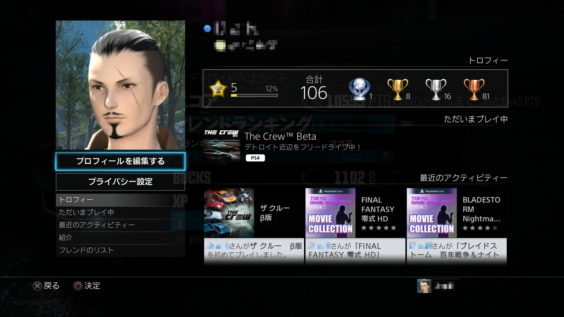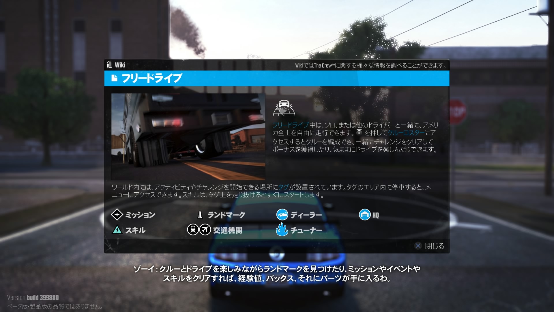ザ・クルーβ版(PS4版)をプレイ(動画あり) その他(Online) 2014年11月26日 話題:The CrewオープンワールドMMOレーシング「ザ・クルー」2014年11月25日(火)~11月28日(金)17:00まで、無料でプレイ可能なオープンβテスト実施とのことで、やってみました(PS4版限定)まずPS StoreからDLするんですが・・・時間帯によってはかなり時間かかりそうですなw動画の前に、先に画像を1枚 オープンワールドのため、これだけの範囲をシームレスに走行可能1度訪れた施設へは瞬時に移動できるほか、交通機関を利用して遠隔地へ移動することも可能ですでは、動画あちこちぶつけまくりの迷いまくりですが、それもまた楽しい他のプレイヤーにぶつけたりもしていますね悪気はないんです・・・見所は、4分30秒時点、6分20秒時点また、7分40秒あたりからストーリー進行投稿 by フランシスコ ザヴィエル.まぁ・・・おそらく最初はみんなヘタですwそれにしてもオープンワールドのMMOなんて随分とメモリ喰いそうなタイプのゲームこれまではほぼPC専用のようなイメージでしたが、PS4ならプレイできるんですねー(シェアもできます!)改めてパワーを見せつけられた気分ですプレイ中、すげぇとかやばいとか連呼していました^^;では、以下はスクショで紹介車カスタマイズこれは、他のレーシングゲームでもあると思いますが外観のカスタマイズや性能の強化などができます 内装も変更可能 フリードライブについて wikiという機能で、解説が見られますプレイヤーたち他のプレイヤーも、通常はフリードライブ状態でそこら中を走ってるわけですねMMOならではの感覚です 付近のプレイヤーを検索し、クルーに加えることができますクルーってのは、一時的に組むパーティみたいなもんですかねークルー同士でボイスチャットができるようです ドライバー情報(実績など)の確認のほか、プレイヤー情報も見られるようで・・・ので、事前にプライバシー設定はしっかりしておいた方がいいと思いますwスキル特定の課題をクリアすることで、報酬が得られるもの 各地に散りばめられていますパーツ 車に装着するパーツ装着することでカーレベルが上昇、性能がアップしていきますプレイヤーのドライバーレベルが低いと装着できない場合があります流れとしては、ミッションやスキルなどをこなしてレベルを上げていき、パーツを集めて車のレベルもアップしていく・・・という感じなんでしょうね探索という楽しみ ランドマークを発見したり、隠しマシン組み立てに必要なスクラップ?を探したりといった楽しみもありますプロローグクリア後のセーブ・・・ セーブ? インストール?この時だけやたら時間がかかりました1時間か? 2時間は掛からなかったと思いますが・・・とにかく長いなんてこともあったもののうーむ、他にもプレイ予定タイトルありますから、これはまだ購入確定ではないんですが、なんつーか惹かれるタイトルではあります Amazon.co.jp ウィジェット Amazon.co.jp ウィジェット Amazon.co.jp ウィジェット[0回]