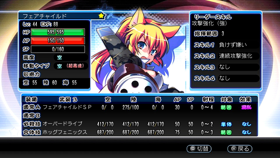 一週目クリア その他(Offline) 2012年08月15日 Vita版 萌え萌え大戦争げんだいばーん++(ぷらすぷらす)一週目をクリアしました しんちゃんの元に通っていて分かったこと 雰囲気が似ていると思ってたら 彼女は、零戦レイの精神を実際に受け継いでたんですねぇ・・・ ちょっと感慨深いエピソードが 本題に入る前に、エンディング主題歌について・・・戦線をクリアする毎にエンディングになりますが、歌がいいですなー 気になって調べてみたら、公募してたんですね PS3版とVita版、別個に PS3版のは、いかにも「あぁ、長い戦いが終わった・・・」って心持ちになれる正統派という印象 Vita版は・・・当然、僕がゲーム中に聴いたのはこっちですが・・・ 初めて聴いたとき、鳥肌がたったw 癒やされるというのは、こういうことか・・・ メロディもさることながら、歌詞がね 戦うために生まれ、長年にわたって戦いつづけ、傷ついてきた鋼の乙女たちに、ぴったり つきあいの長いスミスは、彼女たちに平穏が訪れることを願っていたしね 子から親への感謝の気持ちを歌っているそうですが どうやら、様々なシチュエーションにフィットする歌詞のようです さて、本題 終盤は、ネコと碧、あとフェイが暴れていましたw 全員、武装3 まず、碧(F-2)すまん、画像撮ってなかった 射程強化をあまりしてなくても長射程を誇り・・・攻撃と同時にHPを吸収、回復する性質を持つ駆動部異状の効果まであるので、敵はほとんど近寄れず、一方的に攻撃できるさらに、陸海空すべてに使えて、AP消費も通常の武装と変わらない30という使い勝手の良さ 姉貴分であるグラーフ(F-15)のSP武器も長射程ですが・・・ 空限定で、AP消費が大きめなんですよねぇ つぎ、フェイ(A10サンダーボルト) これ、だいぶ育ててますが、スキルがまだまだ・・・ まぁ、これだけでもかなり鬼です射程は最大4となっていますが、それはあくまで攻撃対象として選べる範囲であって・・・ 攻撃対象を選んで、そこを中心に表示される攻撃範囲があり得ないほど広いw (画面が、範囲を示す青色で埋まっちゃう) おまけに混乱つき (近くにいる相手を敵味方みさかいなく攻撃する。さらに、与えるダメージ1.5倍)実際、敵の乙女が同士討ちして散ったこともありましたなぁ 陸限定ですが、それを補って余りある破壊力をもっています表示のとおり、消費APも30で、通常の武装と変わりません 最後、ネコ(F14トムキャット) レベル50に一番乗りしたのが、ネコw 範囲攻撃の範囲は、そんなメチャ広いわけではないんですが・・・それでも2体以上の敵を巻き込めるのは大きな長所そして、陸海空に使えて消費AP30という使い勝手のよさおまけの感電効果 (ターン開始時のAP回復が半分になる) 武装自体も優秀ですが、それに加えて覚えさせたスキルとの相乗効果で・・・ 前半強化により、5ターン目まで火力が上昇猛追撃により、敵を破壊するとAPが一定量回復 (行動可能な回数が増える)連続攻撃強化により、1ターン中に2回以上攻撃すると与えるダメージが増えて・・・ ぶっちゃけ、ネコが暴れると5ターン以内にケリがつきますw 同等の武装をもつ乙女はほかにもいますが・・・ 特に、碧とネコは出番が多いですからね ベトナム戦線もありますし 成長が早いですな さて、CG回収のため2週目を始めよう・・・ Amazon.co.jp ウィジェット Amazon.co.jp ウィジェット Amazon.co.jp ウィジェット[0回]