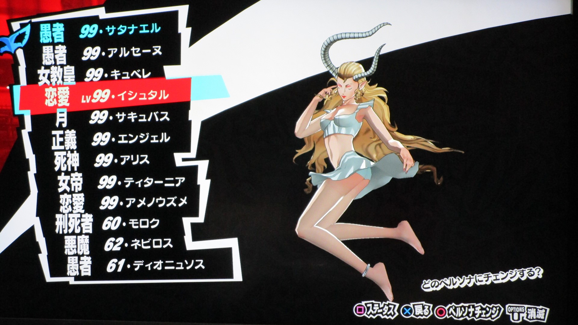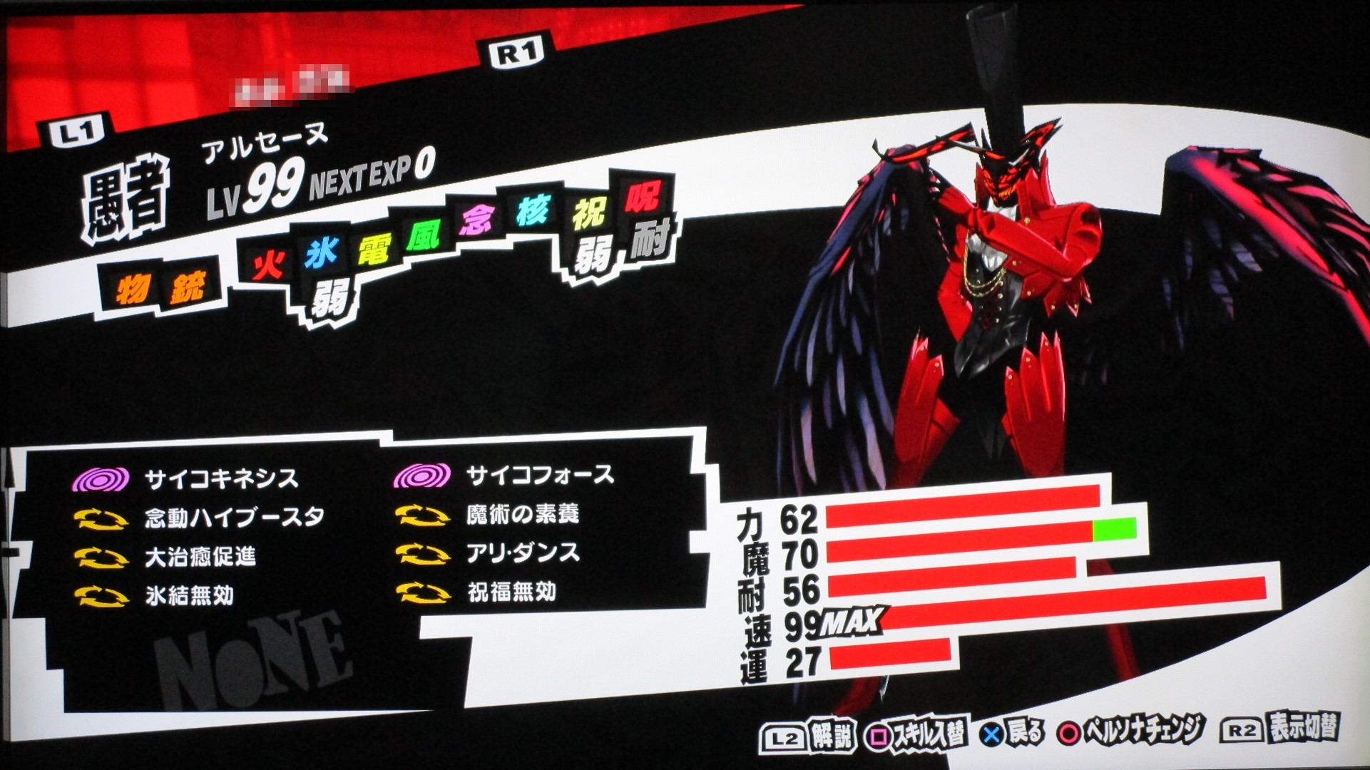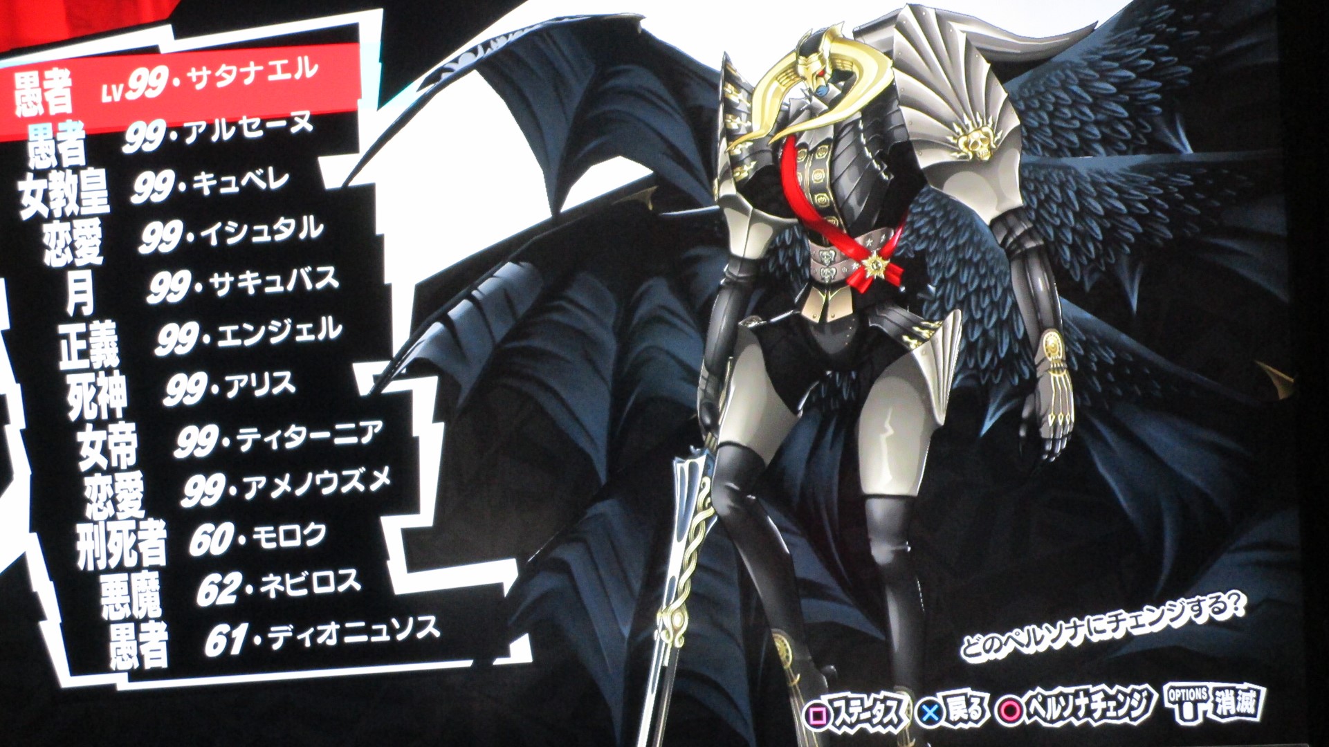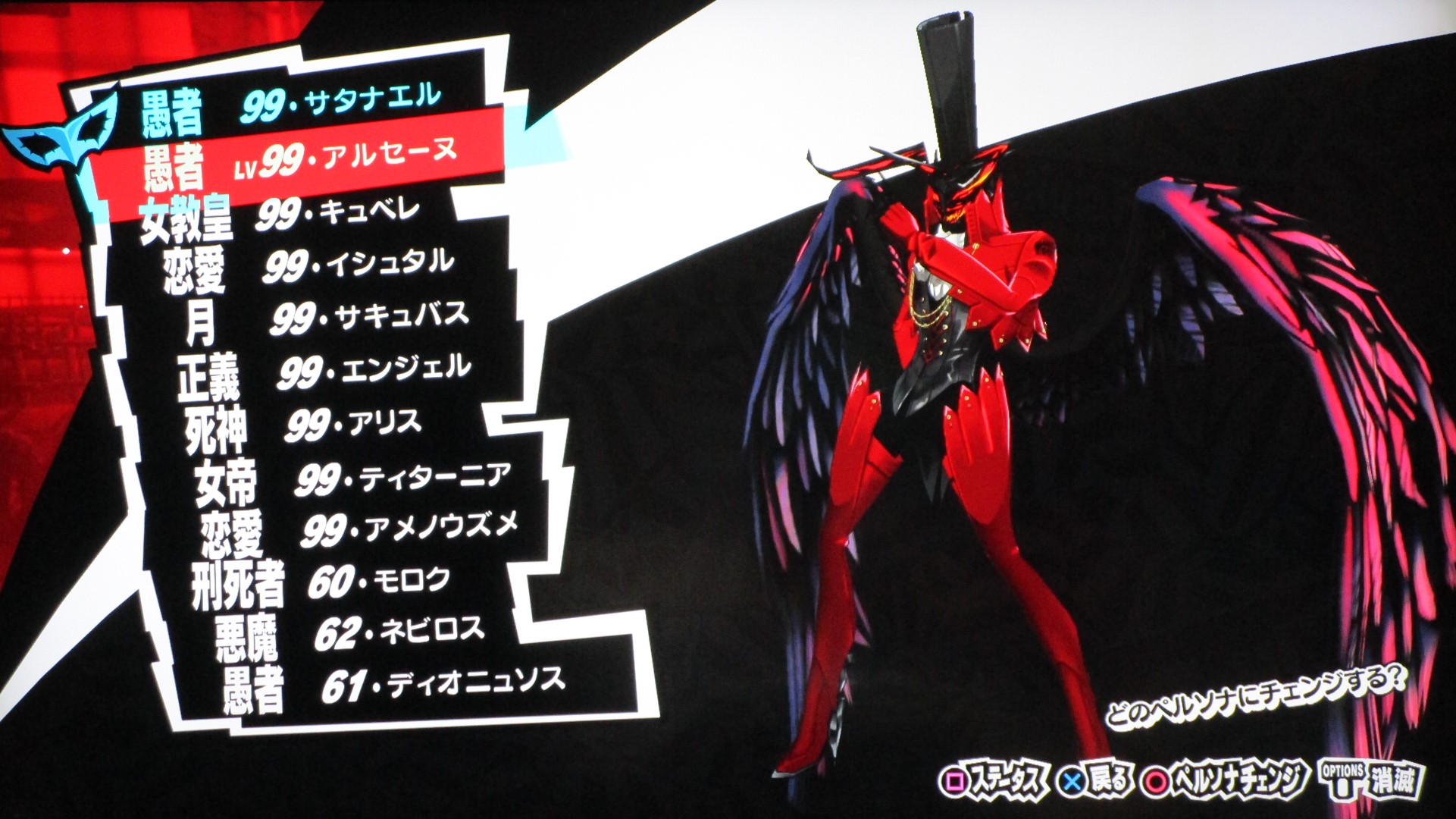 ペルソナ5を満喫 その他(Offline) 2016年11月11日 話題:ペルソナ5なんとか、Gジェネ ジェネシスやFF15発売前に、ペルソナ5を終えられそうです。プレイ自体は発売月の9月から始めていましたが、1度のクリアでは満足&納得のゆく状態では終えられず、珍しく周回プレイをしていました。自分の好きなペルソナを育て、状況に応じてペルソナを切り替えつつ戦うわけですが、ちょっとGジェネなどと似ているところがありますね。気に入ったキャラを好きなように、とことん強化できる・・・こんなに嬉しいことはない(アムロ風(旧ザクを改造レベル99まで育てあげたことを思い出した)と、いうわけで、育てたペルソナを9体、ご紹介します。これらで1つの部隊、チーム、そんな感じです。それぞれ、全身画像とステータス画面の2枚を撮影。(クリックすると別窓で開きます)サタナエルストーリー進行により「愚者」の最強ペルソナ、ヴィシュヌが解禁・・・されたと思ったら、その上がいたというオチwあらゆる攻撃に対して、「耐性」以上の防御特性を備えていますね。この守りを打ち破れるのは、「万能」属性のみでしょう。あえて、単体系の物理アタッカーとしています。というか、全体系まで入れると、急所撃ち(銃撃の攻撃力50%アップ)やアドバイス(クリティカル率アップ)が入らないので。ゴッドハンドは「超特大ダメージ」で、ワンショットキルは「特大ダメージ」ですが、急所撃ちとアドバイス、両スキルに加えて、元々、ワンショットキルはクリティカル率が高いため、こちらで攻撃することも多いです。(消費HPもゴッドハンドより少ない)なお、主人公には、アクセに「貼る大気功」を装備させ、さらに、9体すべてのペルソナに「大治癒促進」を覚えさせているため、HPもSPも毎ターン回復状態。すべてのペルソナに、敵の命中率が自動的に半分になる「アリ・ダンス」を覚えさせています。スキル枠に余裕のあるペルソナには、それに加えて「大天使の加護」、火炎・氷結・疾風・電撃・祝福・呪怨・核熱・念動、各属性の回避率が自動で2倍になるスキルですね。それから、物理主体(サタナエルしかいませんが)のペルソナには、スキル使用時の消費HPが半分になる「武道の心得」を、魔法主体のペルソナには、スキル使用時の消費SPが半分になる「魔術の素養」を、覚えさせています。一部、スキル枠の都合で覚えていないペルソナもいますが、それらのペルソナが覚えているスキルはあまり消費SPが多くないので、よいかと。SP回復手段も用意してありますし。では、続き・・・アメノウズメ 本来、所有していたスキルをがらりと変えまして。核熱系アタッカーにしています。火炎・氷結・電撃・疾風の4属性については仲間に任せることにして、主人公は、核熱・念動・祝福・呪怨・万能属性を揃えています。だからと言って、真(核熱系ペルソナ所持)や春(念動系ペルソナ所持)をバトルメンバーに加えないわけじゃありませんけどね。アルセーヌ 主人公の初期ペルソナですね。速度がとんでもないことに(笑)。で、こちらは念動属性のアタッカー。弱点属性が2つある都合上、大天使の加護を覚えさせることができませんでした。しかし、アレですな。低レベルの内、というか、最初に「合体」を経験するチュートリアルの際にアルセーヌはいったん去ることになりますが・・・。最初は弱かった彼も、Lv.99ともなるとこれほどに強くなるものなんですねぇ。感慨深し。エンジェル 祝福属性のアタッカーということで、本来の性質からの変更はなし。ボス戦も想定しているため、即死系の魔法は外しています。これも元々はレベル10台のペルソナですが、ここまで育てるとやはり強い・・・。アリス 「死神」属性の最強ペルソナ。呪怨属性のアタッカーに。「死んでくれる?」は、敵全体に呪怨属性の即死効果を高確率で与えるもので、育成方針を厳格に適用するなら別のスキルで上書きするところですが、おそらくアリス固有のスキルなのでしょう。せっかくなので残してあります。ところで、合体時のアルカナ属性の関係を、わざわざ表計算ソフトを使って記録しながら自分で調べあげたんですが、「死神」属性のペルソナが誕生する組み合わせでいくら合体してもアリスになりませんで。(モトどまり)こうなったら初期レベルの低いペルソナも含めて試してみようと、色々やっていたら「悪魔」属性同士で誕生したというオチ。キュベレ 「女教皇」属性の最強ペルソナ。苛烈な攻撃も避けられるよう、マハスクカジャを覚えさせ、SP不足に備えて吸魔を。念のため、万能属性魔法もあった方がいいと思い、それも覚えさせておきました。サキュバス サキュバスの初期レベルは、確か7か8か9、そこらです。あくまでサキュバスらしくあって欲しいため性質は変えていませんが、これもアルセーヌやエンジェル同様、かなり強くなりましたね。精神系の状態異常の敵には念動系の攻撃が特効となるので、サキュバスで洗脳 > アルセーヌ