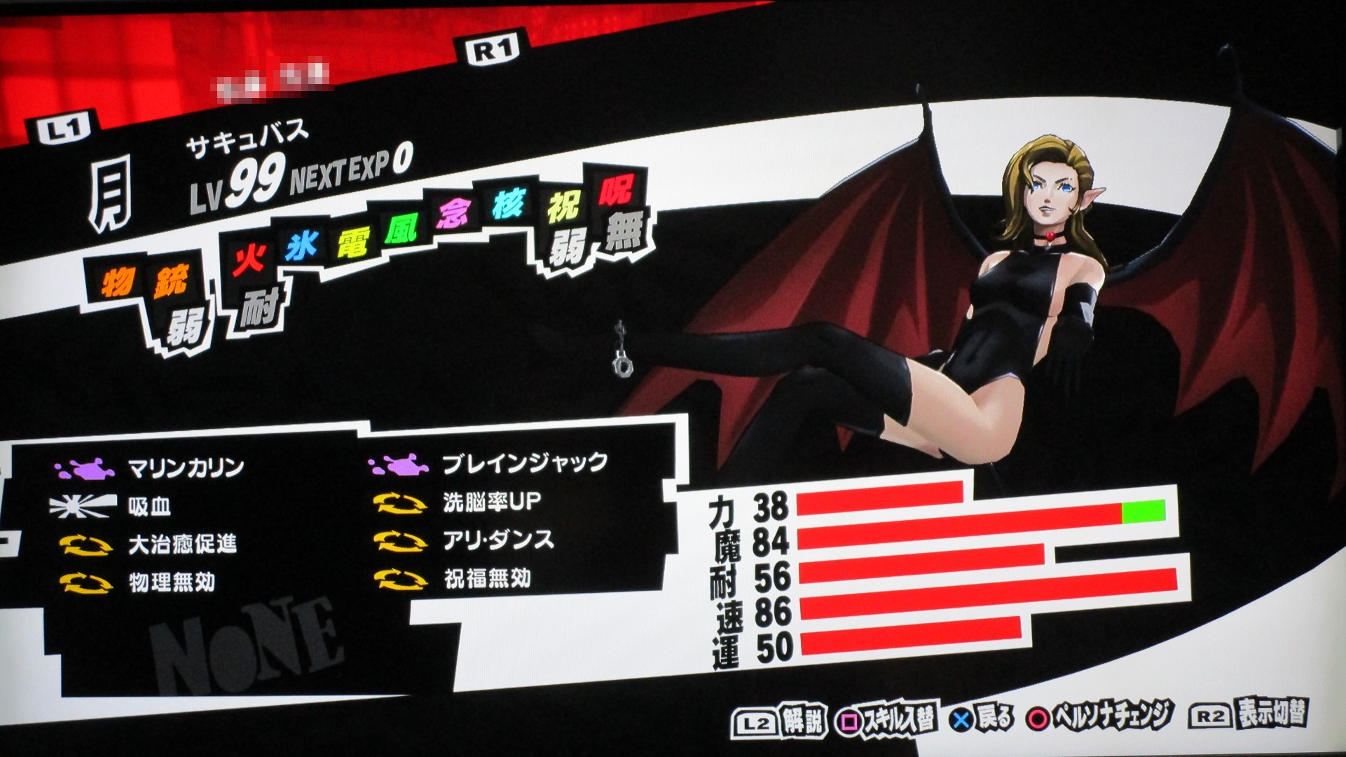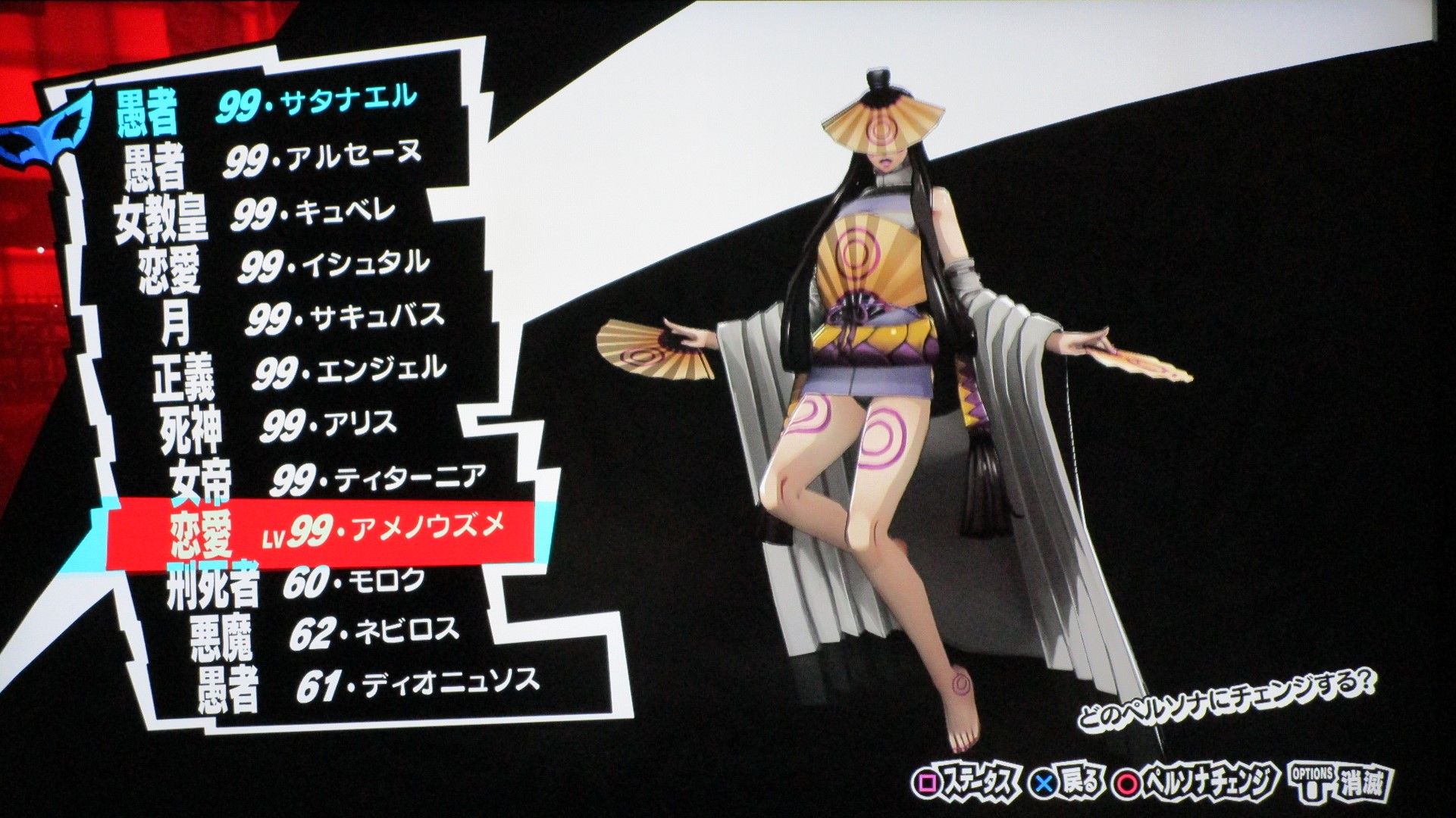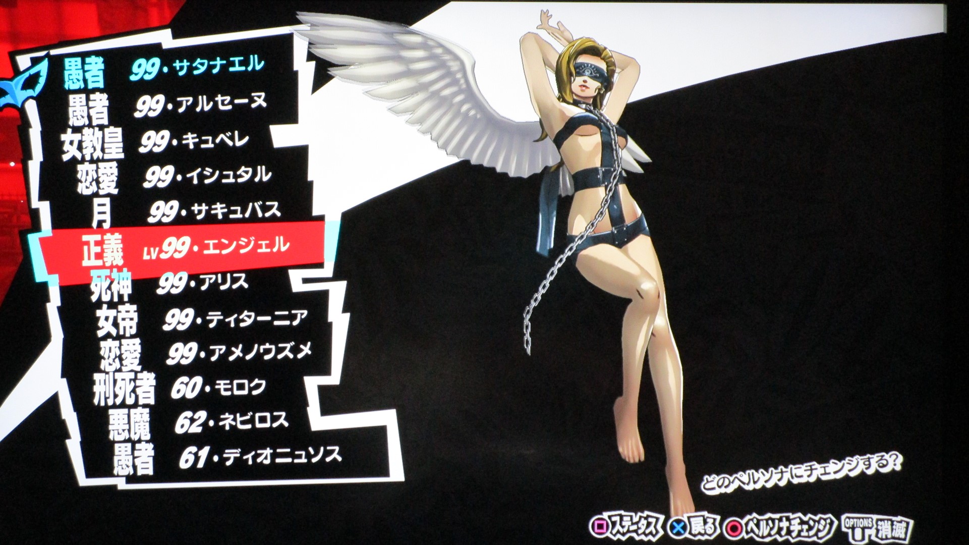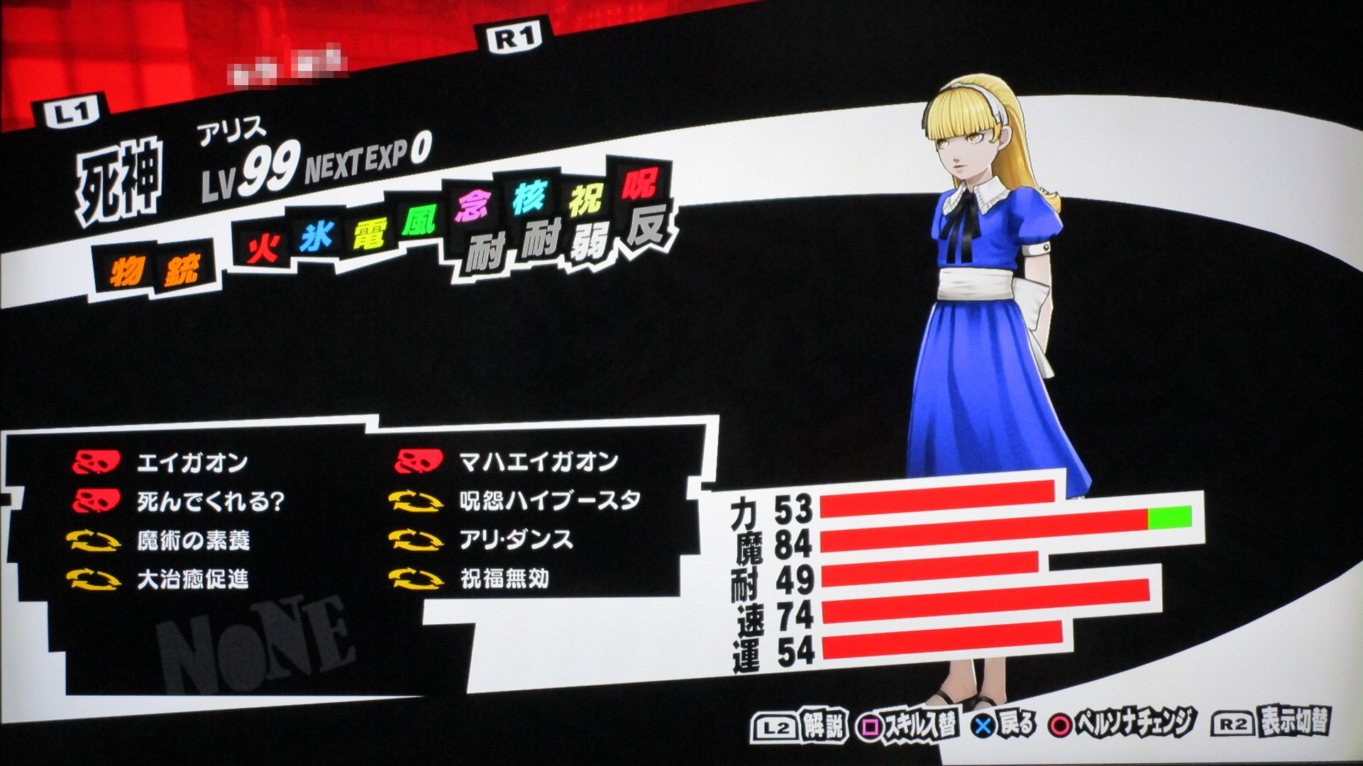 ペルソナ5を満喫 その他(Offline) 2016年11月11日 話題:ペルソナ5なんとか、Gジェネ ジェネシスやFF15発売前に、ペルソナ5を終えられそうです。プレイ自体は発売月の9月から始めていましたが、1度のクリアでは満足&納得のゆく状態では終えられず、珍しく周回プレイをしていました。自分の好きなペルソナを育て、状況に応じてペルソナを切り替えつつ戦うわけですが、ちょっとGジェネなどと似ているところがありますね。気に入ったキャラを好きなように、とことん強化できる・・・こんなに嬉しいことはない(アムロ風(旧ザクを改造レベル99まで育てあげたことを思い出した)と、いうわけで、育てたペルソナを9体、ご紹介します。これらで1つの部隊、チーム、そんな感じです。それぞれ、全身画像とステータス画面の2枚を撮影。(クリックすると別窓で開きます)サタナエルストーリー進行により「愚者」の最強ペルソナ、ヴィシュヌが解禁・・・されたと思ったら、その上がいたというオチwあらゆる攻撃に対して、「耐性」以上の防御特性を備えていますね。この守りを打ち破れるのは、「万能」属性のみでしょう。あえて、単体系の物理アタッカーとしています。というか、全体系まで入れると、急所撃ち(銃撃の攻撃力50%アップ)やアドバイス(クリティカル率アップ)が入らないので。ゴッドハンドは「超特大ダメージ」で、ワンショットキルは「特大ダメージ」ですが、急所撃ちとアドバイス、両スキルに加えて、元々、ワンショットキルはクリティカル率が高いため、こちらで攻撃することも多いです。(消費HPもゴッドハンドより少ない)なお、主人公には、アクセに「貼る大気功」を装備させ、さらに、9体すべてのペルソナに「大治癒促進」を覚えさせているため、HPもSPも毎ターン回復状態。すべてのペルソナに、敵の命中率が自動的に半分になる「アリ・ダンス」を覚えさせています。スキル枠に余裕のあるペルソナには、それに加えて「大天使の加護」、火炎・氷結・疾風・電撃・祝福・呪怨・核熱・念動、各属性の回避率が自動で2倍になるスキルですね。それから、物理主体(サタナエルしかいませんが)のペルソナには、スキル使用時の消費HPが半分になる「武道の心得」を、魔法主体のペルソナには、スキル使用時の消費SPが半分になる「魔術の素養」を、覚えさせています。一部、スキル枠の都合で覚えていないペルソナもいますが、それらのペルソナが覚えているスキルはあまり消費SPが多くないので、よいかと。SP回復手段も用意してありますし。では、続き・・・アメノウズメ 本来、所有していたスキルをがらりと変えまして。核熱系アタッカーにしています。火炎・氷結・電撃・疾風の4属性については仲間に任せることにして、主人公は、核熱・念動・祝福・呪怨・万能属性を揃えています。だからと言って、真(核熱系ペルソナ所持)や春(念動系ペルソナ所持)をバトルメンバーに加えないわけじゃありませんけどね。アルセーヌ 主人公の初期ペルソナですね。速度がとんでもないことに(笑)。で、こちらは念動属性のアタッカー。弱点属性が2つある都合上、大天使の加護を覚えさせることができませんでした。しかし、アレですな。低レベルの内、というか、最初に「合体」を経験するチュートリアルの際にアルセーヌはいったん去ることになりますが・・・。最初は弱かった彼も、Lv.99ともなるとこれほどに強くなるものなんですねぇ。感慨深し。エンジェル 祝福属性のアタッカーということで、本来の性質からの変更はなし。ボス戦も想定しているため、即死系の魔法は外しています。これも元々はレベル10台のペルソナですが、ここまで育てるとやはり強い・・・。アリス 「死神」属性の最強ペルソナ。呪怨属性のアタッカーに。「死んでくれる?」は、敵全体に呪怨属性の即死効果を高確率で与えるもので、育成方針を厳格に適用するなら別のスキルで上書きするところですが、おそらくアリス固有のスキルなのでしょう。せっかくなので残してあります。ところで、合体時のアルカナ属性の関係を、わざわざ表計算ソフトを使って記録しながら自分で調べあげたんですが、「死神」属性のペルソナが誕生する組み合わせでいくら合体してもアリスになりませんで。(モトどまり)こうなったら初期レベルの低いペルソナも含めて試してみようと、色々やっていたら「悪魔」属性同士で誕生したというオチ。キュベレ 「女教皇」属性の最強ペルソナ。苛烈な攻撃も避けられるよう、マハスクカジャを覚えさせ、SP不足に備えて吸魔を。念のため、万能属性魔法もあった方がいいと思い、それも覚えさせておきました。サキュバス サキュバスの初期レベルは、確か7か8か9、そこらです。あくまでサキュバスらしくあって欲しいため性質は変えていませんが、これもアルセーヌやエンジェル同様、かなり強くなりましたね。精神系の状態異常の敵には念動系の攻撃が特効となるので、サキュバスで洗脳 > アルセーヌ