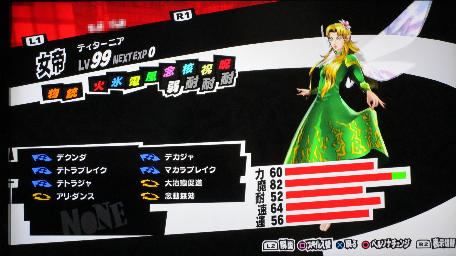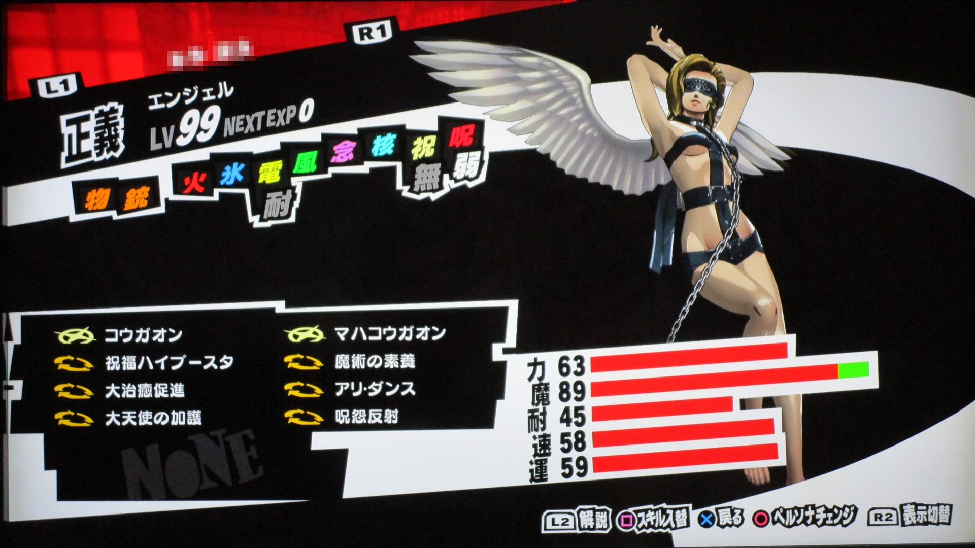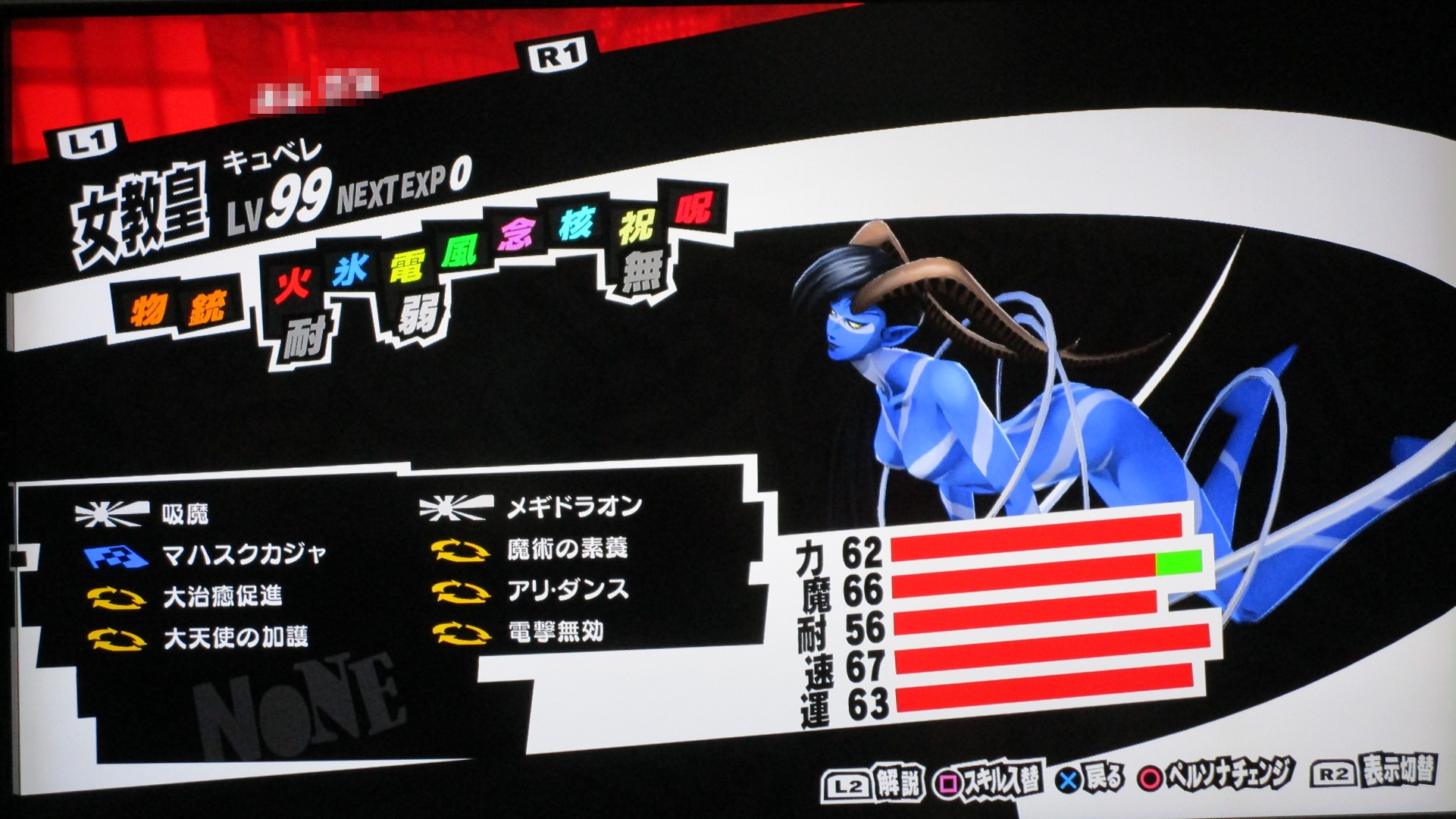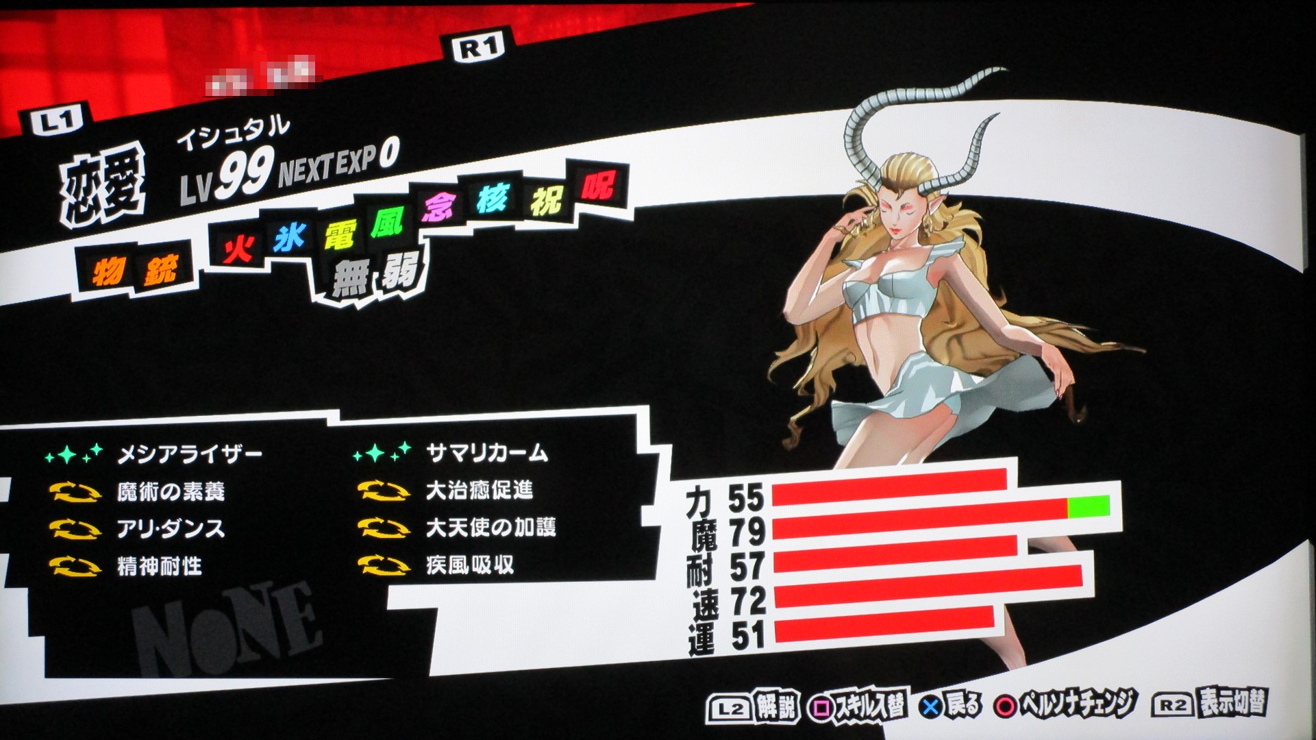 ペルソナ5を満喫 その他(Offline) 2016年11月11日 話題:ペルソナ5なんとか、Gジェネ ジェネシスやFF15発売前に、ペルソナ5を終えられそうです。プレイ自体は発売月の9月から始めていましたが、1度のクリアでは満足&納得のゆく状態では終えられず、珍しく周回プレイをしていました。自分の好きなペルソナを育て、状況に応じてペルソナを切り替えつつ戦うわけですが、ちょっとGジェネなどと似ているところがありますね。気に入ったキャラを好きなように、とことん強化できる・・・こんなに嬉しいことはない(アムロ風(旧ザクを改造レベル99まで育てあげたことを思い出した)と、いうわけで、育てたペルソナを9体、ご紹介します。これらで1つの部隊、チーム、そんな感じです。それぞれ、全身画像とステータス画面の2枚を撮影。(クリックすると別窓で開きます)サタナエルストーリー進行により「愚者」の最強ペルソナ、ヴィシュヌが解禁・・・されたと思ったら、その上がいたというオチwあらゆる攻撃に対して、「耐性」以上の防御特性を備えていますね。この守りを打ち破れるのは、「万能」属性のみでしょう。あえて、単体系の物理アタッカーとしています。というか、全体系まで入れると、急所撃ち(銃撃の攻撃力50%アップ)やアドバイス(クリティカル率アップ)が入らないので。ゴッドハンドは「超特大ダメージ」で、ワンショットキルは「特大ダメージ」ですが、急所撃ちとアドバイス、両スキルに加えて、元々、ワンショットキルはクリティカル率が高いため、こちらで攻撃することも多いです。(消費HPもゴッドハンドより少ない)なお、主人公には、アクセに「貼る大気功」を装備させ、さらに、9体すべてのペルソナに「大治癒促進」を覚えさせているため、HPもSPも毎ターン回復状態。すべてのペルソナに、敵の命中率が自動的に半分になる「アリ・ダンス」を覚えさせています。スキル枠に余裕のあるペルソナには、それに加えて「大天使の加護」、火炎・氷結・疾風・電撃・祝福・呪怨・核熱・念動、各属性の回避率が自動で2倍になるスキルですね。それから、物理主体(サタナエルしかいませんが)のペルソナには、スキル使用時の消費HPが半分になる「武道の心得」を、魔法主体のペルソナには、スキル使用時の消費SPが半分になる「魔術の素養」を、覚えさせています。一部、スキル枠の都合で覚えていないペルソナもいますが、それらのペルソナが覚えているスキルはあまり消費SPが多くないので、よいかと。SP回復手段も用意してありますし。では、続き・・・アメノウズメ 本来、所有していたスキルをがらりと変えまして。核熱系アタッカーにしています。火炎・氷結・電撃・疾風の4属性については仲間に任せることにして、主人公は、核熱・念動・祝福・呪怨・万能属性を揃えています。だからと言って、真(核熱系ペルソナ所持)や春(念動系ペルソナ所持)をバトルメンバーに加えないわけじゃありませんけどね。アルセーヌ 主人公の初期ペルソナですね。速度がとんでもないことに(笑)。で、こちらは念動属性のアタッカー。弱点属性が2つある都合上、大天使の加護を覚えさせることができませんでした。しかし、アレですな。低レベルの内、というか、最初に「合体」を経験するチュートリアルの際にアルセーヌはいったん去ることになりますが・・・。最初は弱かった彼も、Lv.99ともなるとこれほどに強くなるものなんですねぇ。感慨深し。エンジェル 祝福属性のアタッカーということで、本来の性質からの変更はなし。ボス戦も想定しているため、即死系の魔法は外しています。これも元々はレベル10台のペルソナですが、ここまで育てるとやはり強い・・・。アリス 「死神」属性の最強ペルソナ。呪怨属性のアタッカーに。「死んでくれる?」は、敵全体に呪怨属性の即死効果を高確率で与えるもので、育成方針を厳格に適用するなら別のスキルで上書きするところですが、おそらくアリス固有のスキルなのでしょう。せっかくなので残してあります。ところで、合体時のアルカナ属性の関係を、わざわざ表計算ソフトを使って記録しながら自分で調べあげたんですが、「死神」属性のペルソナが誕生する組み合わせでいくら合体してもアリスになりませんで。(モトどまり)こうなったら初期レベルの低いペルソナも含めて試してみようと、色々やっていたら「悪魔」属性同士で誕生したというオチ。キュベレ 「女教皇」属性の最強ペルソナ。苛烈な攻撃も避けられるよう、マハスクカジャを覚えさせ、SP不足に備えて吸魔を。念のため、万能属性魔法もあった方がいいと思い、それも覚えさせておきました。サキュバス サキュバスの初期レベルは、確か7か8か9、そこらです。あくまでサキュバスらしくあって欲しいため性質は変えていませんが、これもアルセーヌやエンジェル同様、かなり強くなりましたね。精神系の状態異常の敵には念動系の攻撃が特効となるので、サキュバスで洗脳 > アルセーヌ