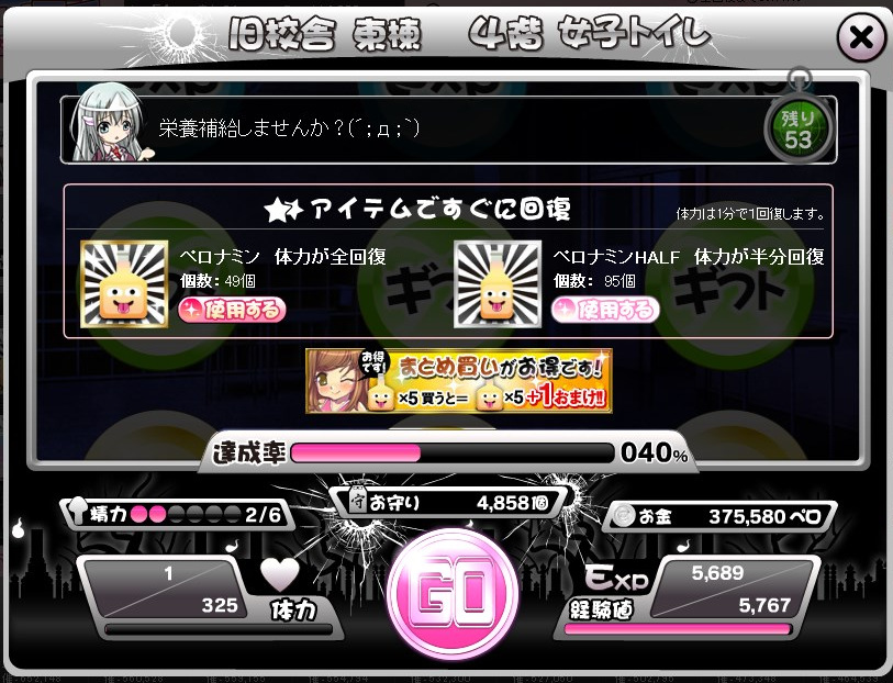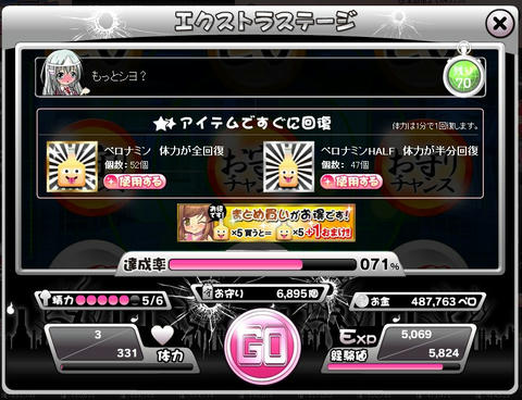 ペロペロ大作戦0901 その他(Online) 2013年09月01日 話題:ペロペロ催眠 今回のペロペロ大作戦イベントでは、前回やむなく終盤に課金してしまった反省(?)から、自分なりに戦術を練った上で臨みました まず、最初にちょっと和み(?)ましょうか・・・ 要所要所で登場する、人体模型のもっくん いい味出してましたw さて、大作戦では体力がモノを言います 体力さえ確保できれば、あとはごり押しで進んでいけます 今回からは、「運命の選択」を3度間違えると正解が1つ増える仕様となったため、どんなに運が悪くともいつかは正解できます 時折、出現する敵は精力を消費して倒しますが、精力が尽きていても構わずに「VS」すると逃がして進むことができます とは言え、何の考えもなしに最初から飛ばしていたのでは後半に入って息切れするおそれがあります 前回の自分がまさにそれ ということで、この間の親衛隊イベントで大量に獲得していたペロナミン(体力回復剤)をまず温存 どのくらい消費するかは運次第ですからね・・・ あと、メガネは後半戦の終盤まで残しておいた方が良いです 特に196ヶ所目以降は、毎回、運命の選択が正解1つな状態から始まるので^^; メガネを前半で景気よく消費してしまうと後々、大変になってきます 所持数と相談して、計画的に使用しましょう 事前の備えはぬかりなし いざ、大作戦スタート 前半戦はペロナミンを一切使わずに進め、期間終了の1日前に100ヶ所到達しました これは想定通り 後半戦スタート時点の状態 ペロナミン49個、HALF95個 初日からHALFを投入してガンガン進みました そして・・・ 後半戦開始から1日経たずに200ヶ所到達 前半のゆっくりペースを知っていたペロ友には、驚かれたようですw 報酬でもらっている分もあるため、HALFはもっと使ったと思います ペロナミンはまったく使いませんでした(逆に報酬で増加 この後、お守りを10000個集めてお守り獲得報酬もすべてゲット お守り獲得数の期間ランキングや総合ランキングではあまり振るわなかったものの、一切無課金で目標を達成できたので、満足な結果でした Amazon.co.jp ウィジェット Amazon.co.jp ウィジェット Amazon.co.jp ウィジェット[0回]