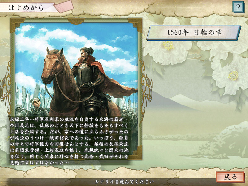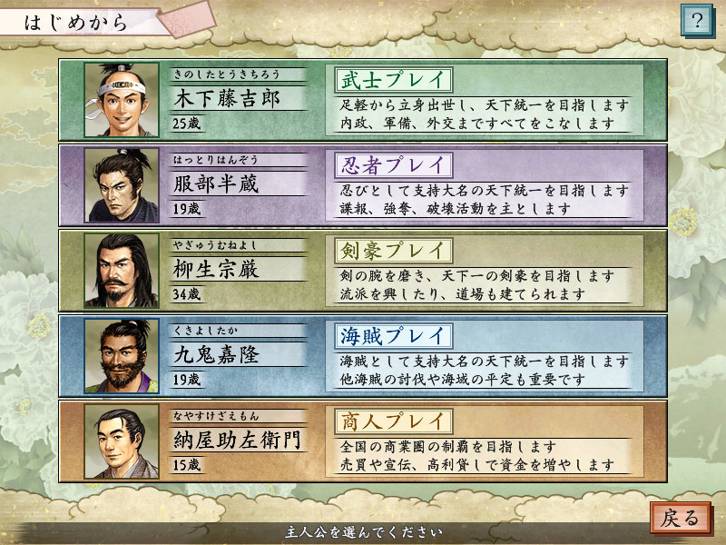 太閤5:前書き 太閤立志伝V 2009年10月27日 たまにはオフラインゲームを楽しもうかと思って探していて目に付いたのが、「真・女神転生 STRANGE JOURNEY」この10月発売の新作ということもあり、購入を検討していたんですが・・・ 結局、買ったのは「太閤立志伝V」だったというw (Windows版・PS2版・PSP版が発売されています) 太閤5は2004年発売ということでもう5年ほど前のものですが、まぁ、そうなると当然、安価なベスト版が出てますよね・・・ 自由度の高さと値段の安さが決め手です 主人公を替えたりして、何度も楽しめるのも良いですしね (古くても話題に出来る) 前作と違い、個人戦や合戦はカードバトルではありません ちゃんとキャラクタや部隊を移動させて戦います合戦もターン制で、ヘックス(六角形のマス)上を移動していくタイプ あぁ、懐かしいw 「信長の野望」の合戦は今やすべてリアルタイム制ですからねぇ・・・ (それが悪いということではないんですが、うーむ) 太閤立志伝はSLG要素を持ったRPGということもあってか、信長の野望に比べて気楽に楽しめるのが良いです 「戦国世界での人生を楽しんでみたい」ということなら太閤立志伝ですな そんなわけで、まずは簡単に紹介しておきます (以下の内容はWindows版に準拠します) 最初に選べる主人公はこの5人 その他大勢の人物や(プレイヤーが作成できる)新武将とは異なり、ある程度のストーリーが用意されています (別に、それに沿って進めなくても良いんですけどね) そして、主人公札は800枚に及びます・・・ 中には、親密になる以外に特定の入手条件が設定されている人物もおり、全部集めようとするとなかなか大変そうです 誰でどのような人生を楽しむか、迷っちまいますな 最初に選べるシナリオはこれ 「桶狭間の戦い」直前からスタートします プレイ中、条件を満たすと増えていきます この数年前から始まるものや、秀吉死後のものなど・・・ 主人公札収集を主目的とするなら、お目当ての人物が生きているシナリオを選びましょう 初回プレイでは、親切にこのような表示が出ます (2回目以降は選択した項目次第) まず、4種類の勢力(大名家・忍者衆・海賊衆・商家)があり、それぞれの覇権を掛けて争っています それとは別に、求道(ぐどう)系の職業・・・ 剣豪・茶人・医師・鍛冶屋があり、これまたそれぞれの道で天下一を目指せるようになっています 浪人はもちろん、勢力に所属していても求道系職業を極めることが可能です 但し、複数の求道系職業を極めることはできません (仕事場は1つしか持てない) そいじゃ、次回からはまず、「サルがゆく」ということで藤吉郎(秀吉)プレイを綴っていきますかな Amazon.co.jp ウィジェット Amazon.co.jp ウィジェット Amazon.co.jp ウィジェット[0回]