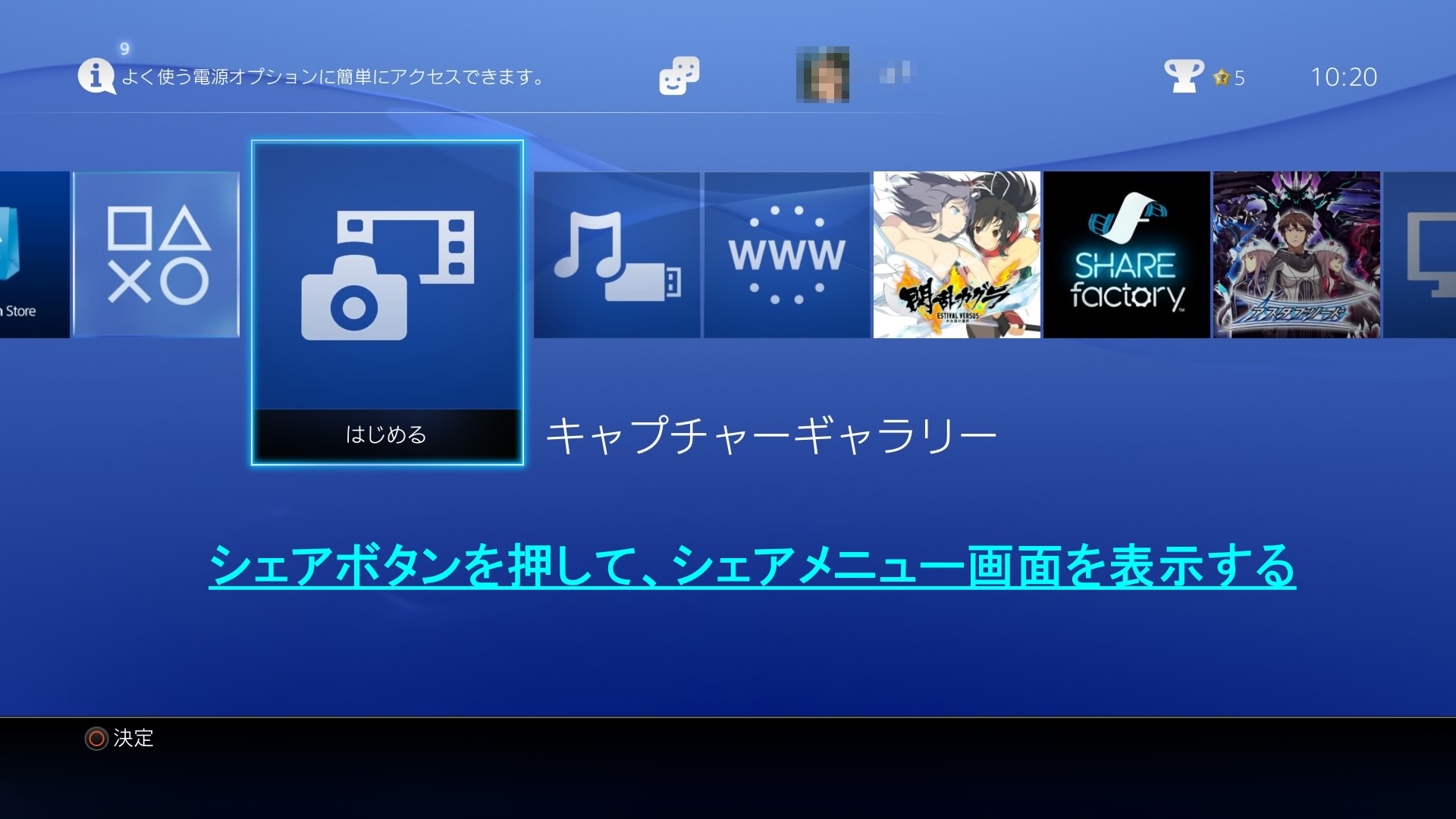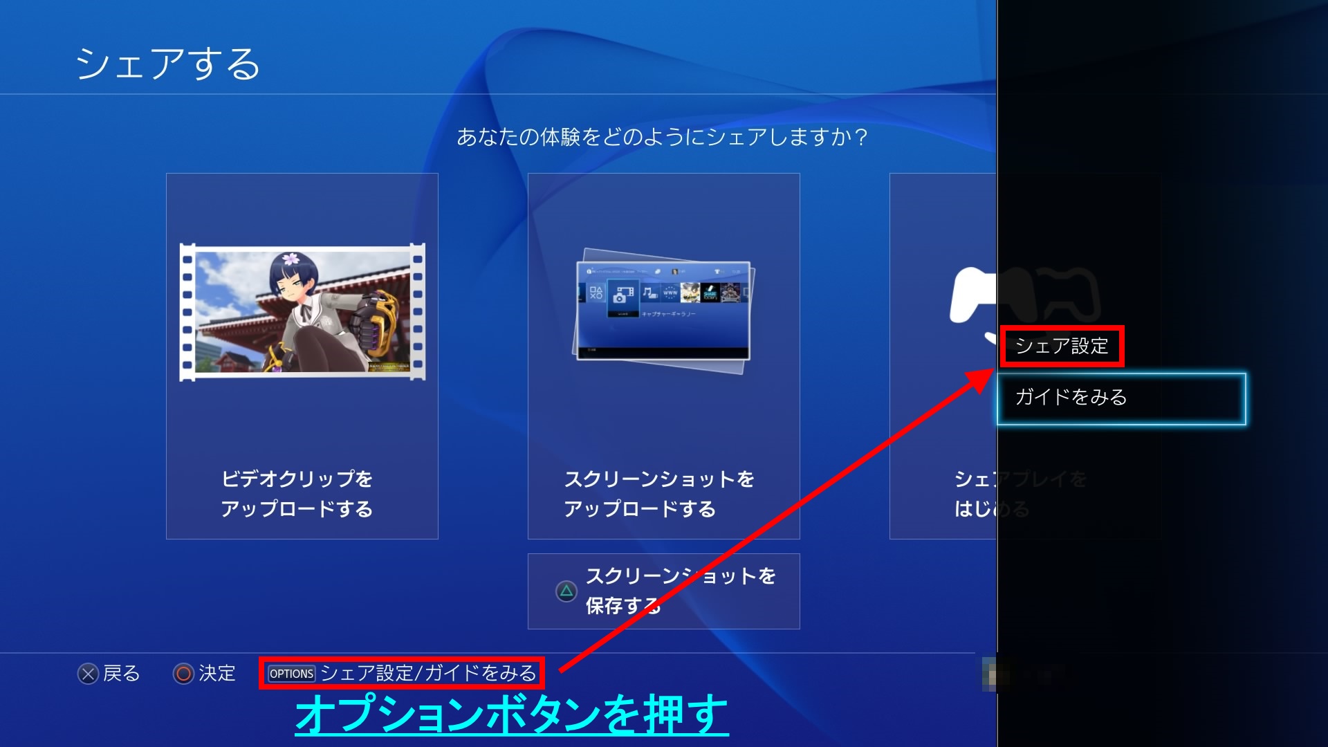 PS4:スクショをワンタッチで(シェア画面を表示せずに)撮る方法 雑記 2015年04月10日 話題:PlayStation4閃乱カグラ~ESTIVAL VERSUS~の情報を扱っているサイトをいくつか閲覧していたときのこと情報自体は大変参考になりましたが、1点、気になったことがPS4版とPS Vita版との違いについて掲載しているところなんですがPS Vitaではワンタッチでスクショ(スクリーンショット)を撮影可能対してPS4では、シェアボタンを1回押すと撮影できるものの一々シェアメニュー画面が表示されるためやりづらく、長押しすると撮影のみを行えるものの撮影タイミングがずれるためやりづらいよって、スクショマンはVita版の方がいいという内容そうなんですPS4は、スクショ撮影がやりにくいんですよね・・・・・・・・・・・・デフォルトのままだとというわけで、設定変更の方法ですシェアメニュー画面を表示できる状態なら、いつでも変更可能です まず、シェアボタンを押して、シェアメニュー画面を表示 画面下に操作ガイドが表示されていますが、ここでオプションボタンを押しますすると右側にメニューが出るので、「シェア設定」を選択 シェア設定画面で、「SHAREボタン操作のタイプ」を選択(デフォルトではここが「標準」になっています) SHAREボタン操作のタイプで、「スクリーンショット向け」を選択画像に表示されているとおり、こうするとワンタッチで、シェア画面を表示せずにスクショを撮影できますなお、このことはPS4ユーザーズガイド(公式サイト)にも記載されています他にも基本的なことが記載されていますので、やりづらさを感じたり困ったりした際に、チェックしてみるといいかもしれませんアクションの瞬間を逃さないところで、動きの速いアクションゲームで特定の瞬間を捉えてスクショを撮影したい場合、PS4の方がいいですなぜなら、PS4はゲームプレイを動画として記録・保存できるため予め、PSストアから動画加工用アプリの「SHARE factory」(無料)をDL、インストールしておきますそしてゲームのプレイ中、「お、今のはいい絵になってたんじゃないか!?」と思ったらシェアボタンを(長)押し、記録中の動画をビデオクリップとして正式に保存(PS4はゲームプレイ中、常に記録しています)(2016/11/3 追記)システムアップデートにより、「キャプチャーギャラリー」内に保存された動画の「トリミング」作業中に、任意のシーンで撮影できるようになりましたオプションボタンを押して「トリミング」を選び・・・撮影したい位置まで移動して・・・□ボタンでフルスクリーン表示にした状態でシェアボタンを押して撮影する方法と、○ボタンを押すと表示されるメニューから「スクリーンショットとして保存」する方法とがありますなお、前者の解像度は、PS4本体設定の「映像出力設定」に準拠するもよう後者は、動画の解像度のまま保存されます---追記、以上SHARE factoryを起動し、上で保存したビデオクリップを読み込み右スティックや左右十字キーで、タイムライン上の撮影したい位置まで移動(キャプチャーギャラリー上の再生では、細かく位置調整できない)L2ボタンを押してフルスクリーン表示にするあとは、下部の操作ガイドが消えたらシェアボタンを押して撮影、です動画として圧縮保存されたものを撮影するため、ふつうにスクショを撮るよりいくらか画質は落ちますまた、動きが速すぎて捉え切れていない場合もありますそれでも、アクションゲームの「瞬間」を捉えるためにこういう方法もあることを知っていると、よりスクショ撮影も楽しくなるのではと思います Amazon.co.jp ウィジェット Amazon.co.jp ウィジェット Amazon.co.jp ウィジェット[1回]